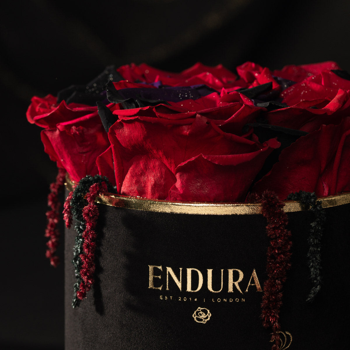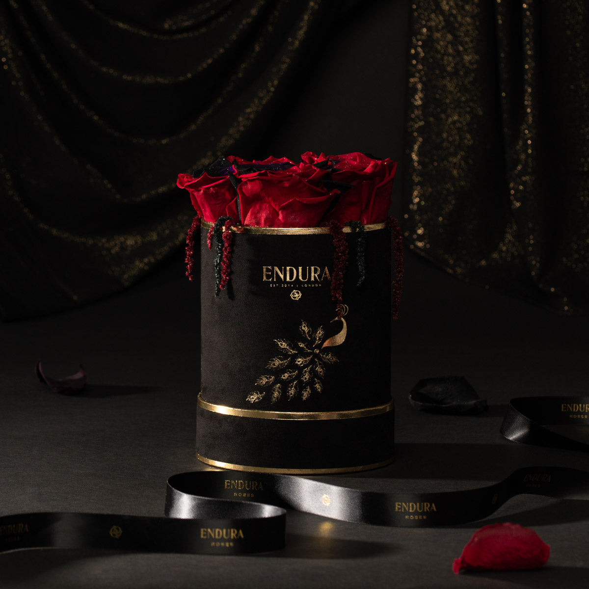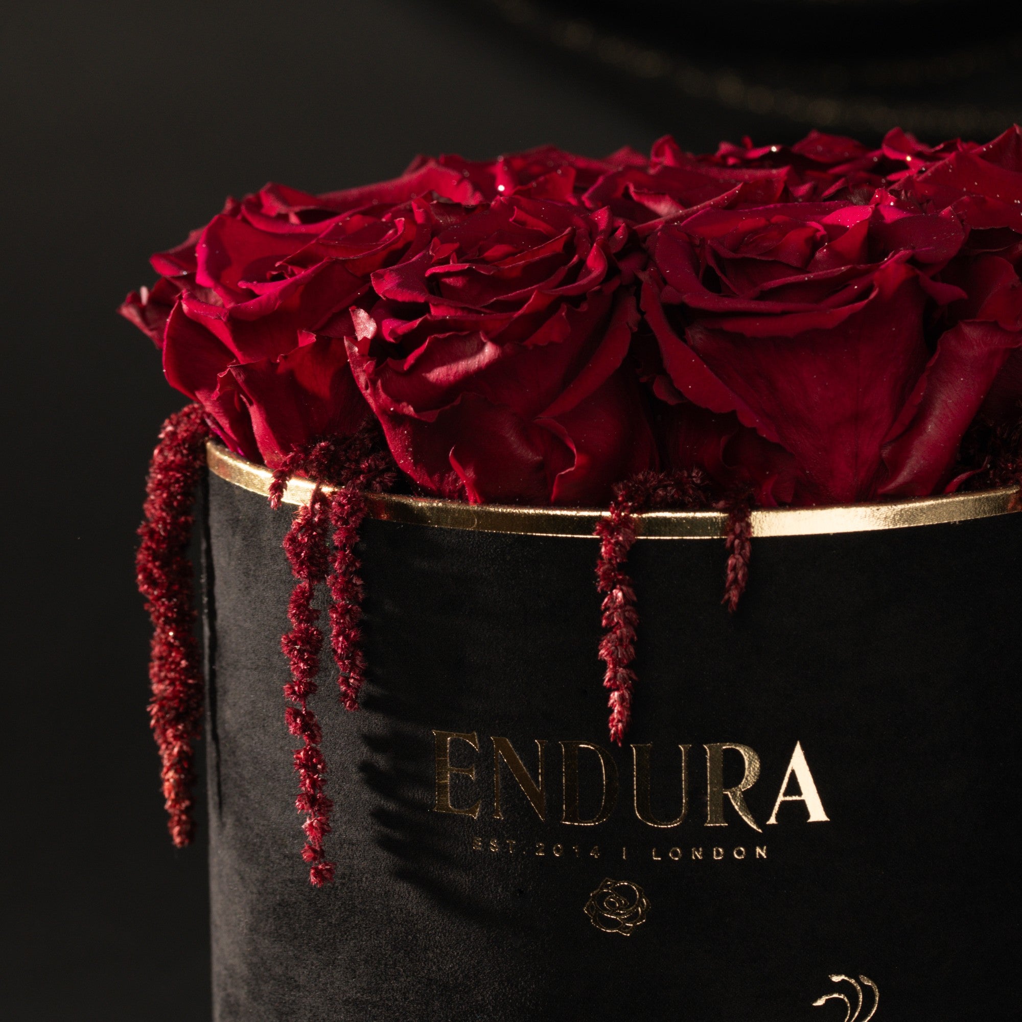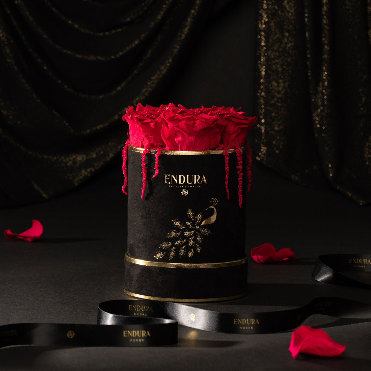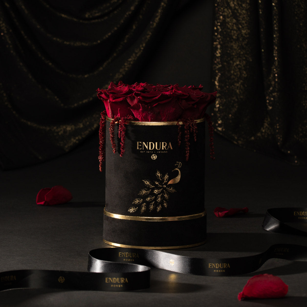 Endura Bloom is elegantly presented in a sumptuous velvet-textured box, within lies a curated selection of exquisite natural roses, each meticulously preserved to perfection and offered in an array of captivating shades. A symbol of timeless beauty and refinement; every bloom embodies artistry and precision, retaining its natural beauty for up to three years.