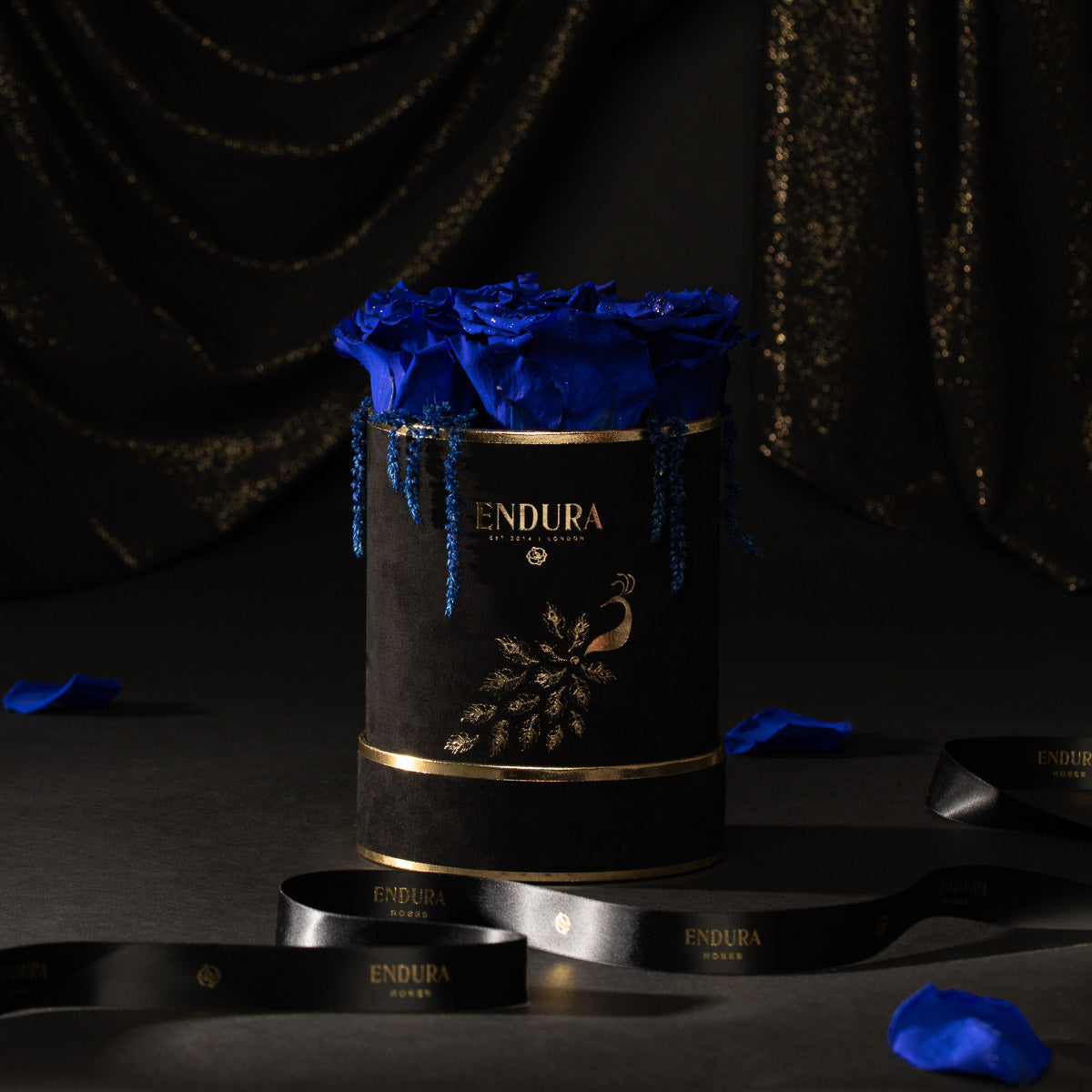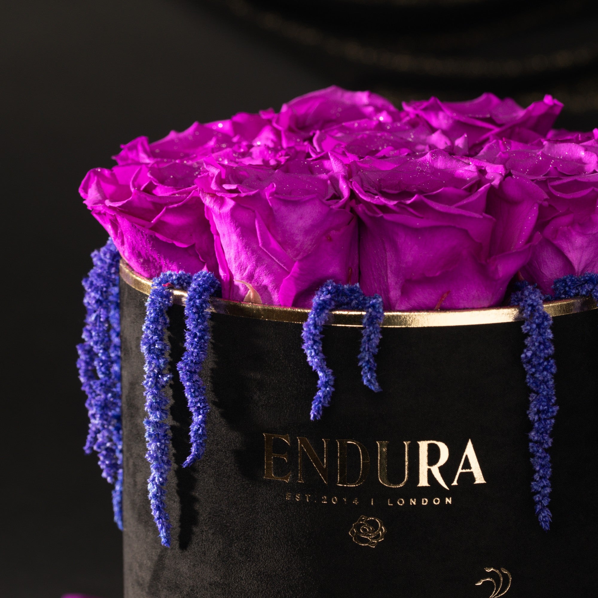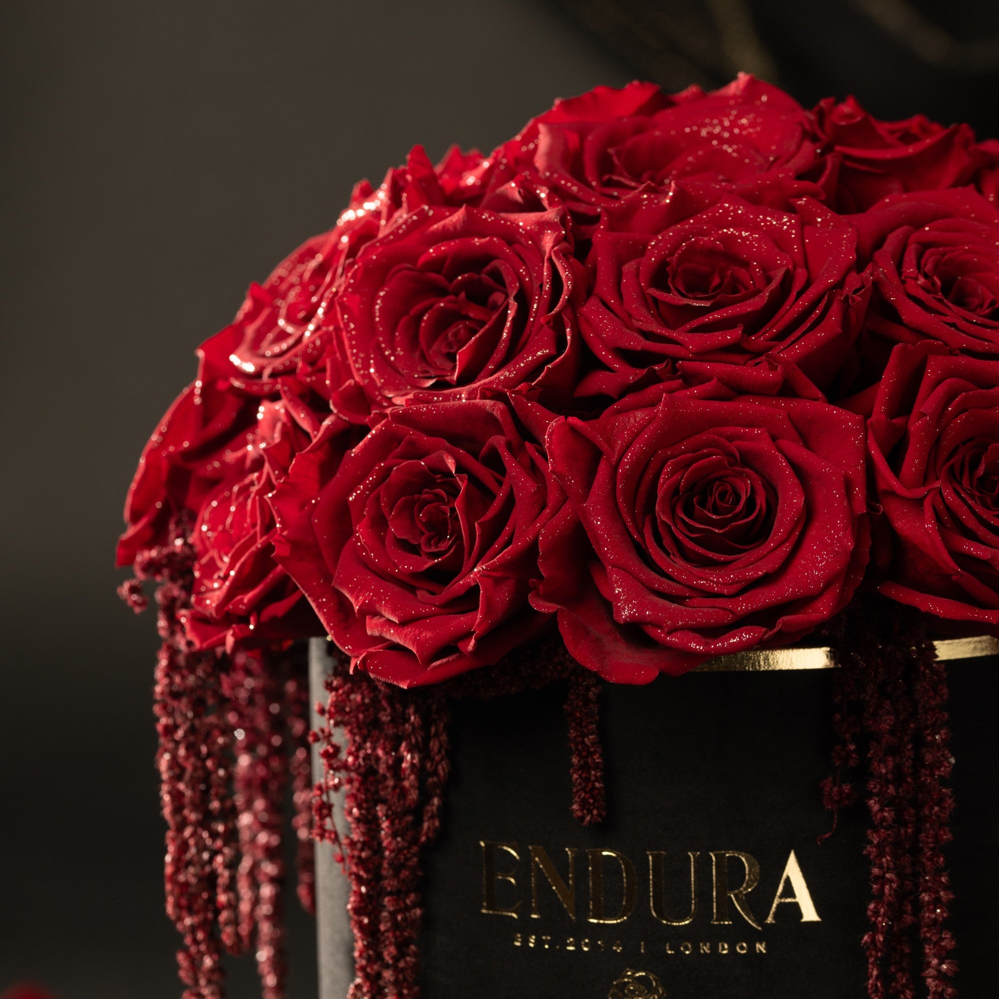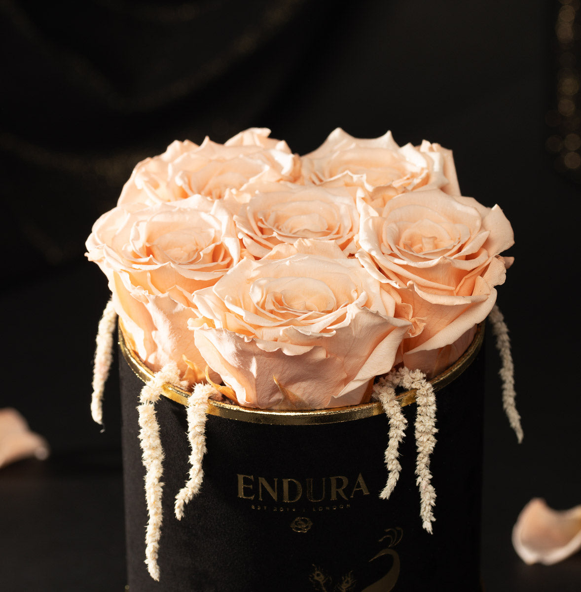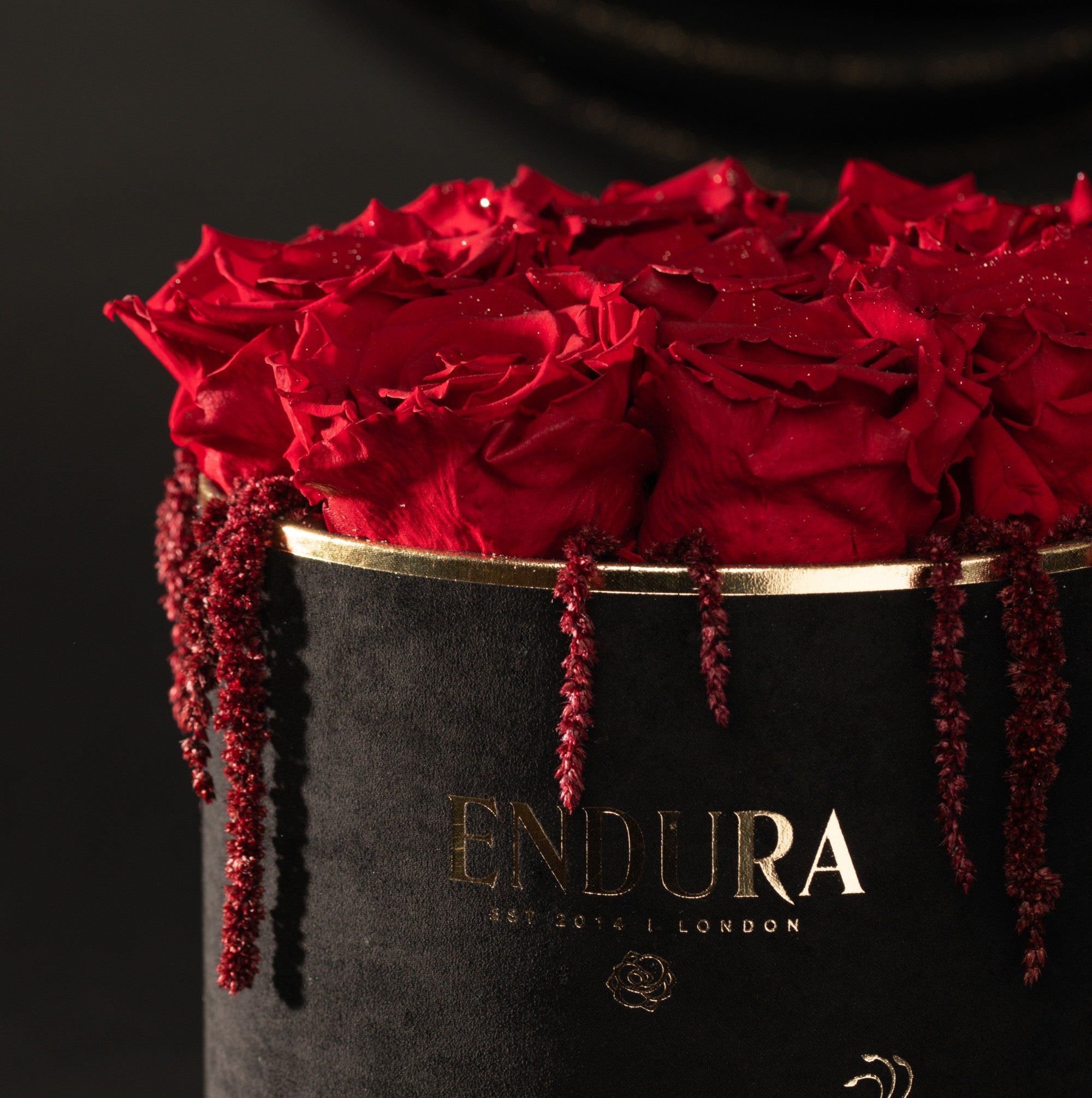 Endura Bloom is elegantly presented in a sumptuous velvet-textured box, within lies a curated selection of exquisite natural roses, each meticulously preserved to perfection and offered in an array of captivating shades. A symbol of timeless beauty and refinement; every bloom embodies artistry and precision, retaining its natural beauty for up to three years.