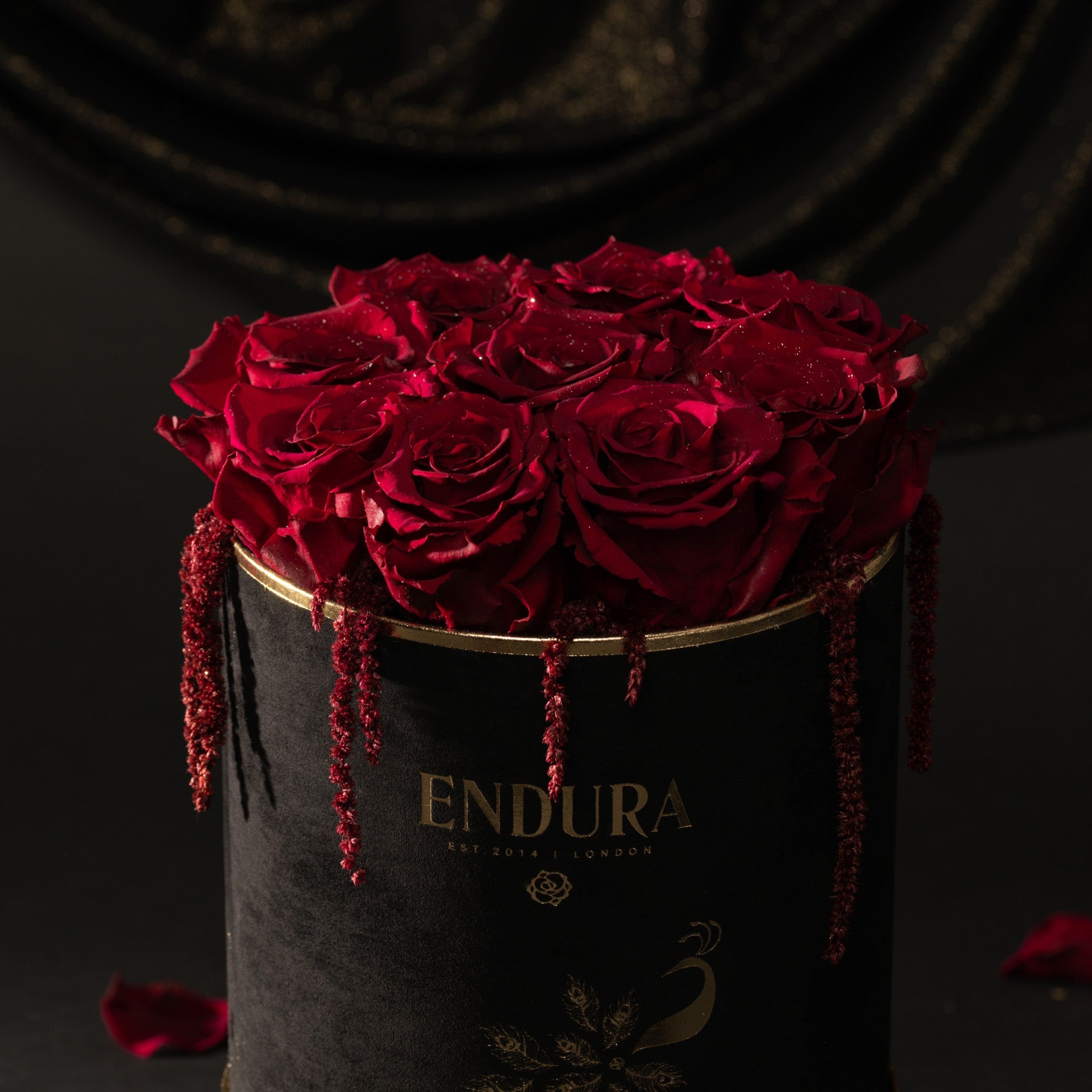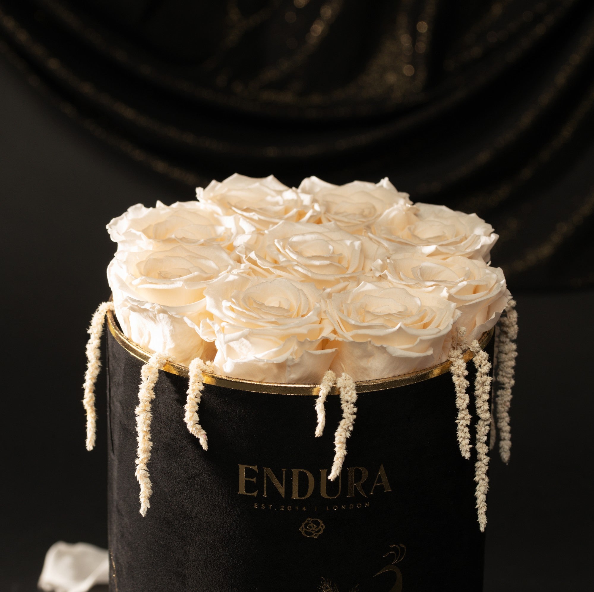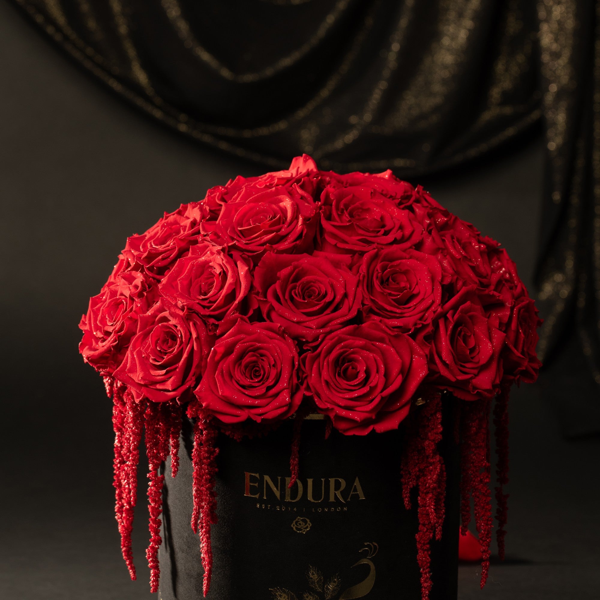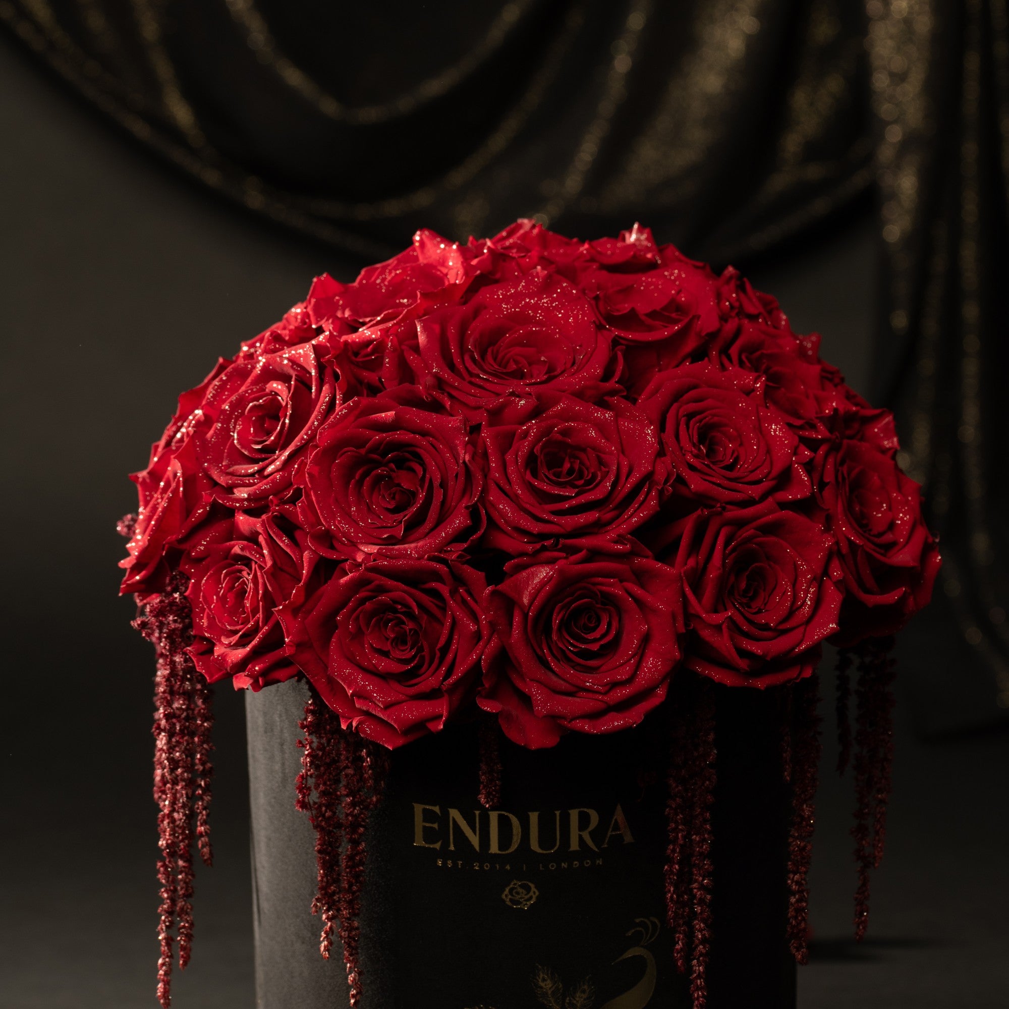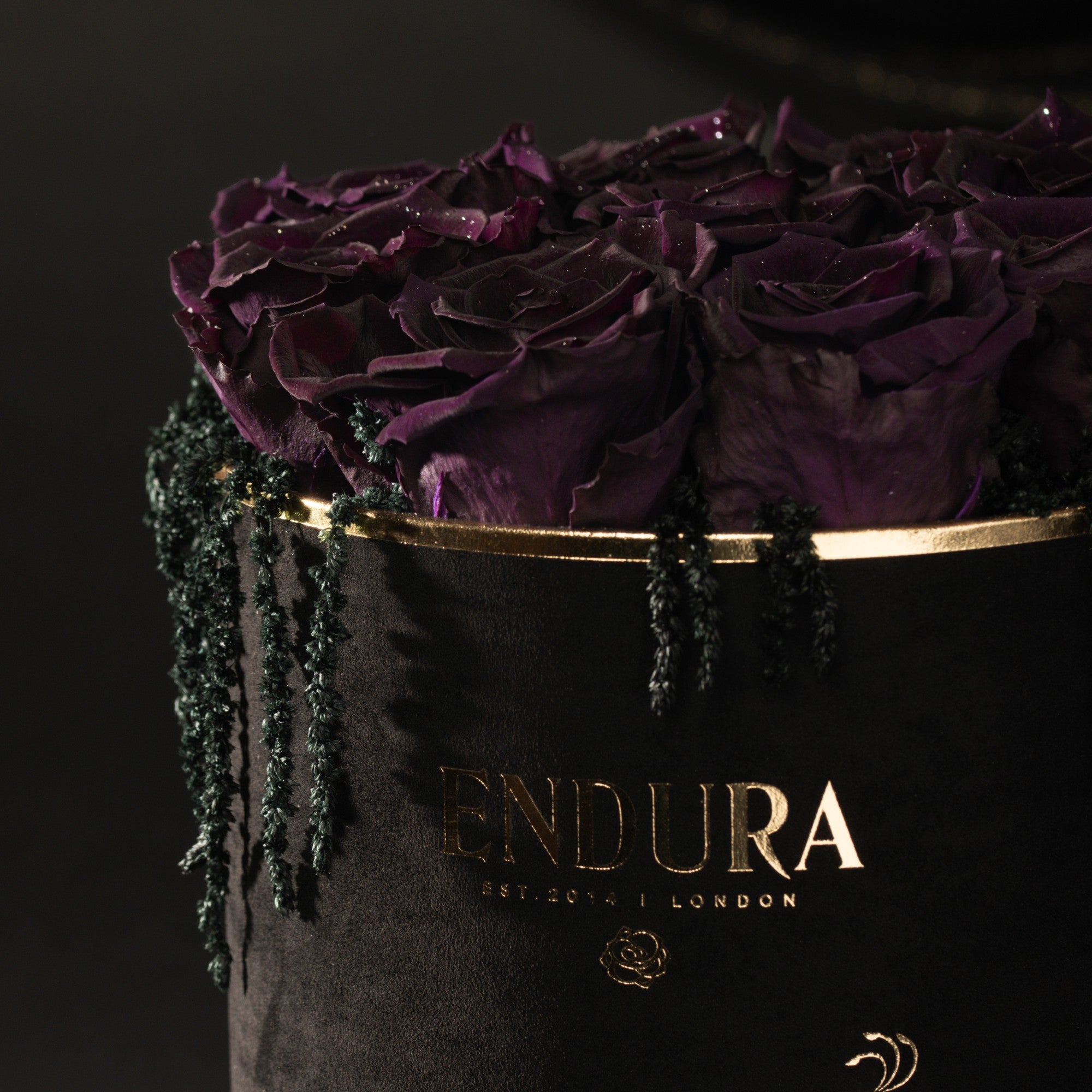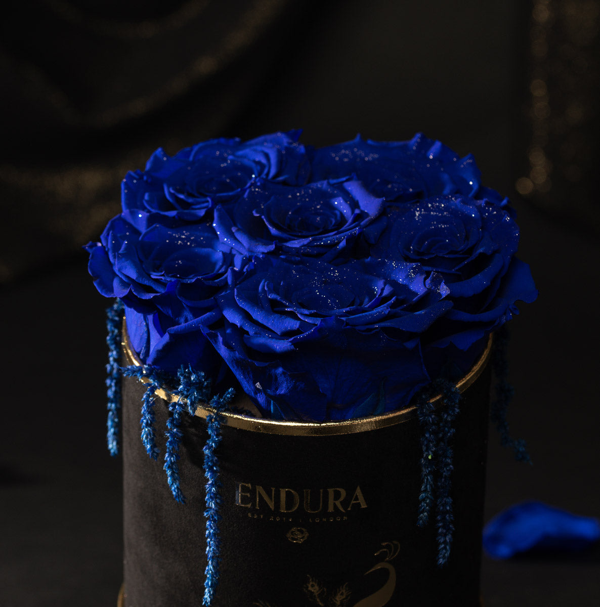 Endura Bloom is elegantly presented in a sumptuous velvet-textured box, within lies a curated selection of exquisite natural roses, each meticulously preserved to perfection and offered in an array of captivating shades. A symbol of timeless beauty and refinement; every bloom embodies artistry and precision, retaining its natural beauty for up to three years.