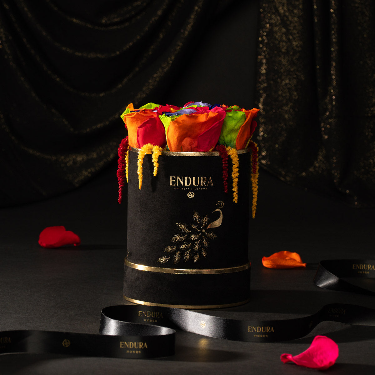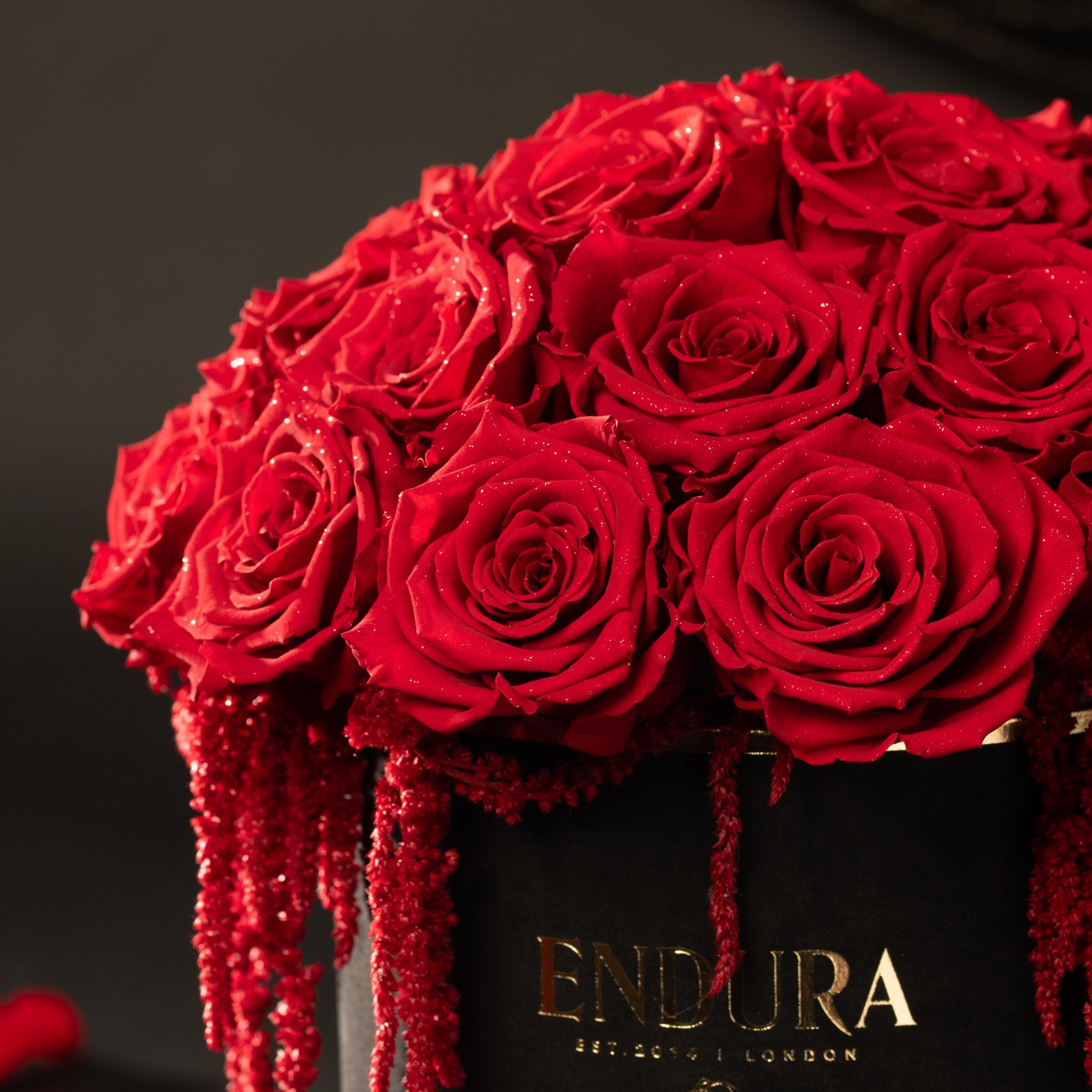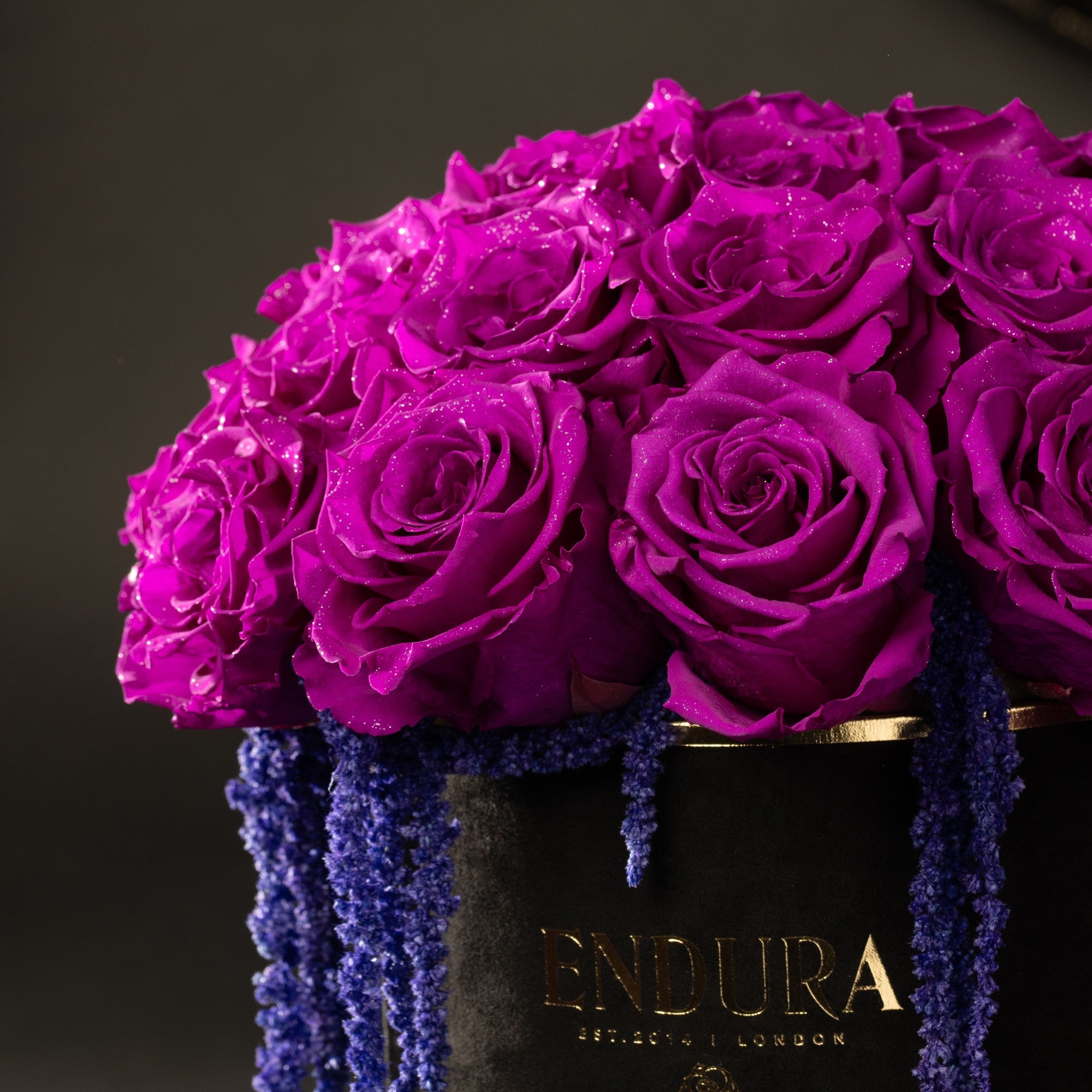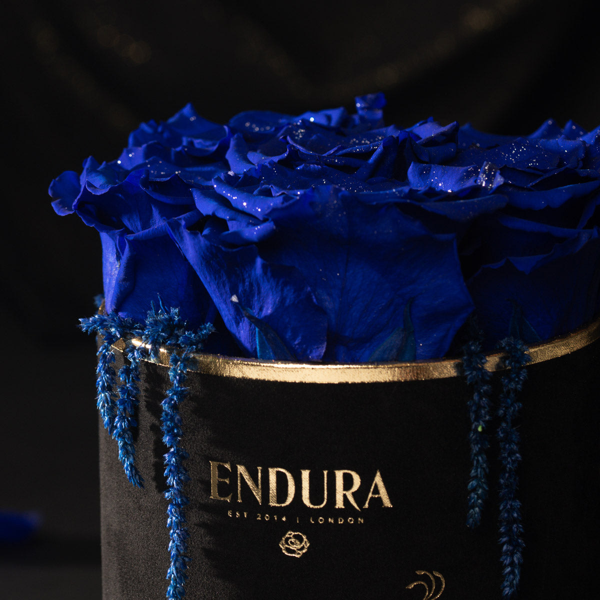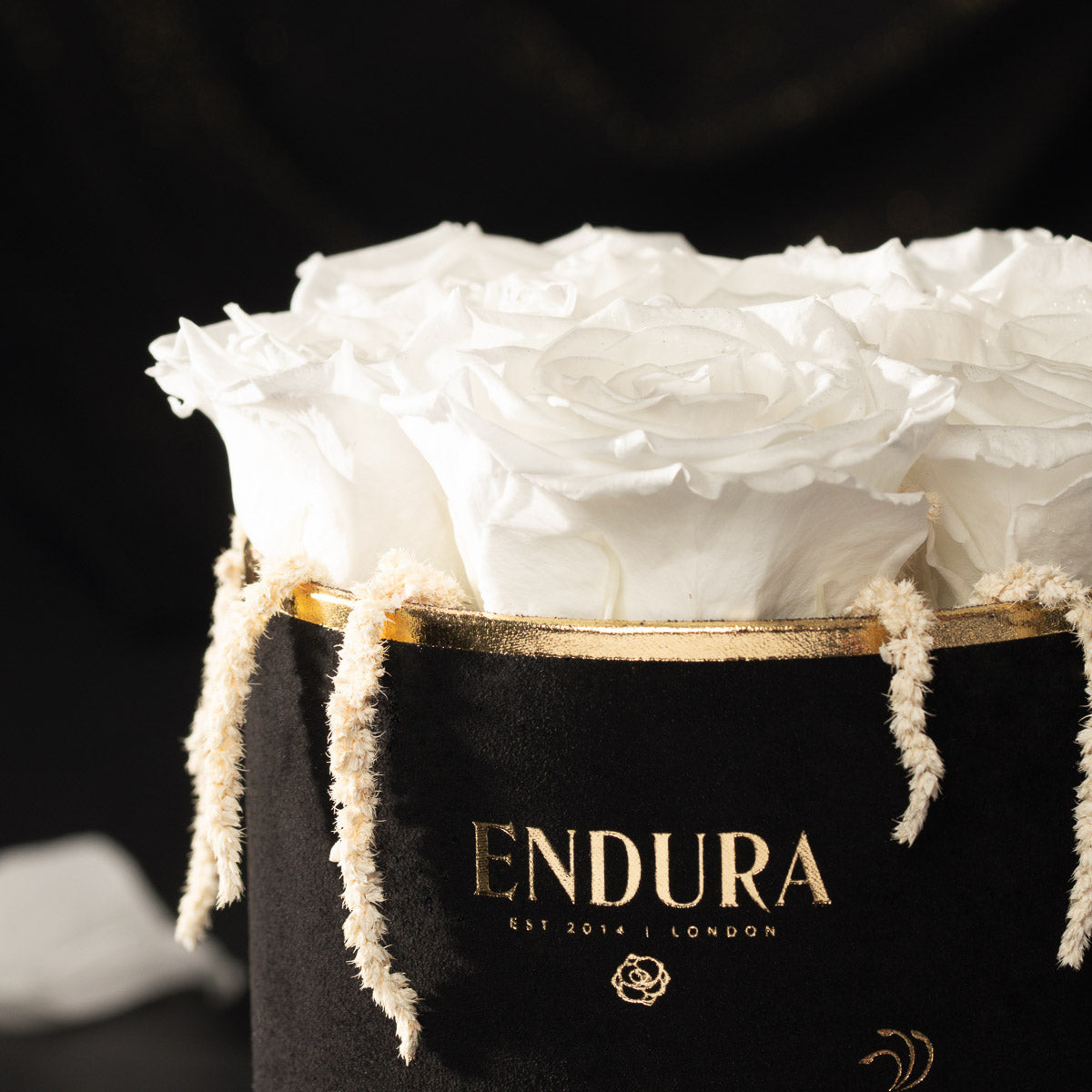 Endura Bloom is elegantly presented in a sumptuous velvet-textured box, within lies a curated selection of exquisite natural roses, each meticulously preserved to perfection and offered in an array of captivating shades. A symbol of timeless beauty and refinement; every bloom embodies artistry and precision, retaining its natural beauty for up to three years.