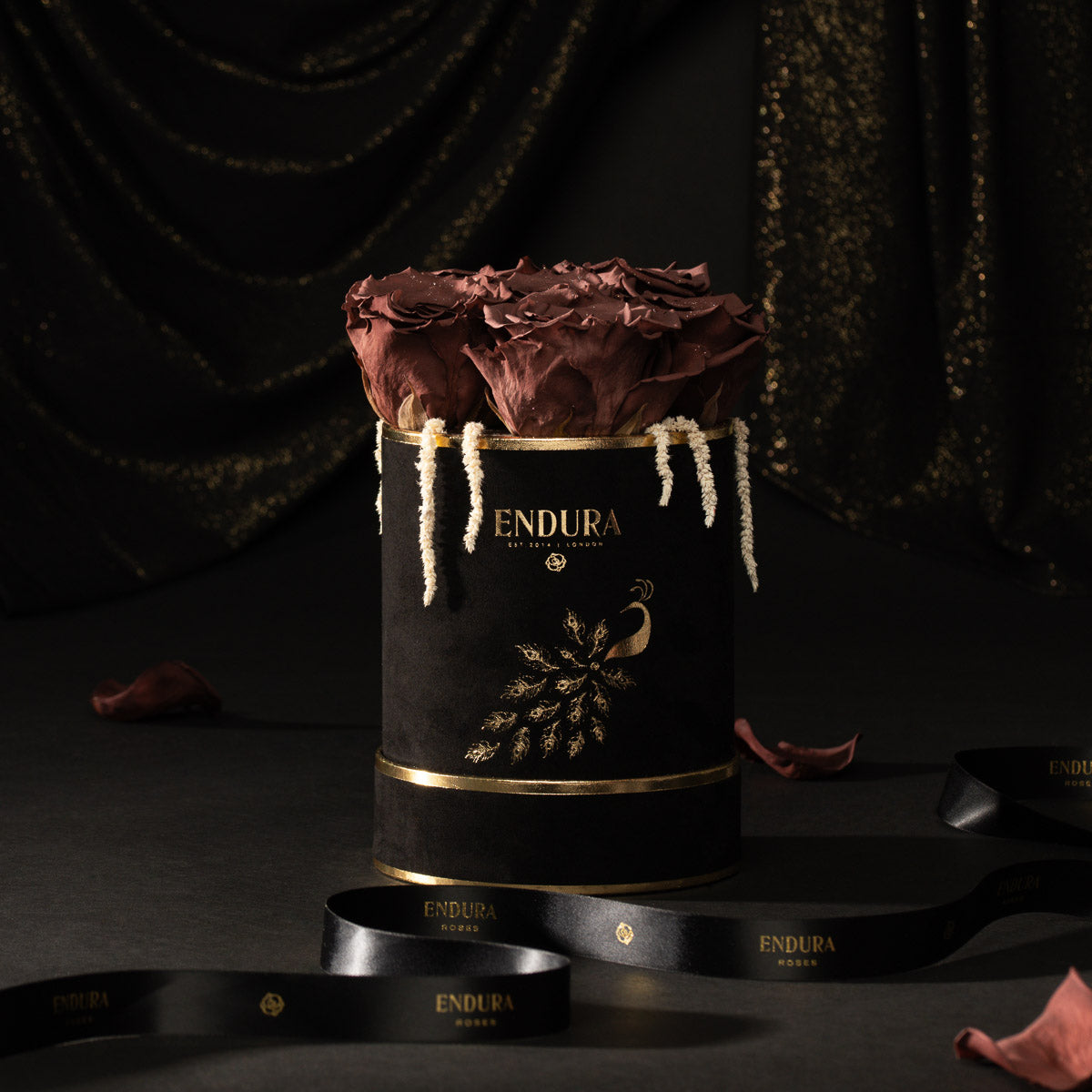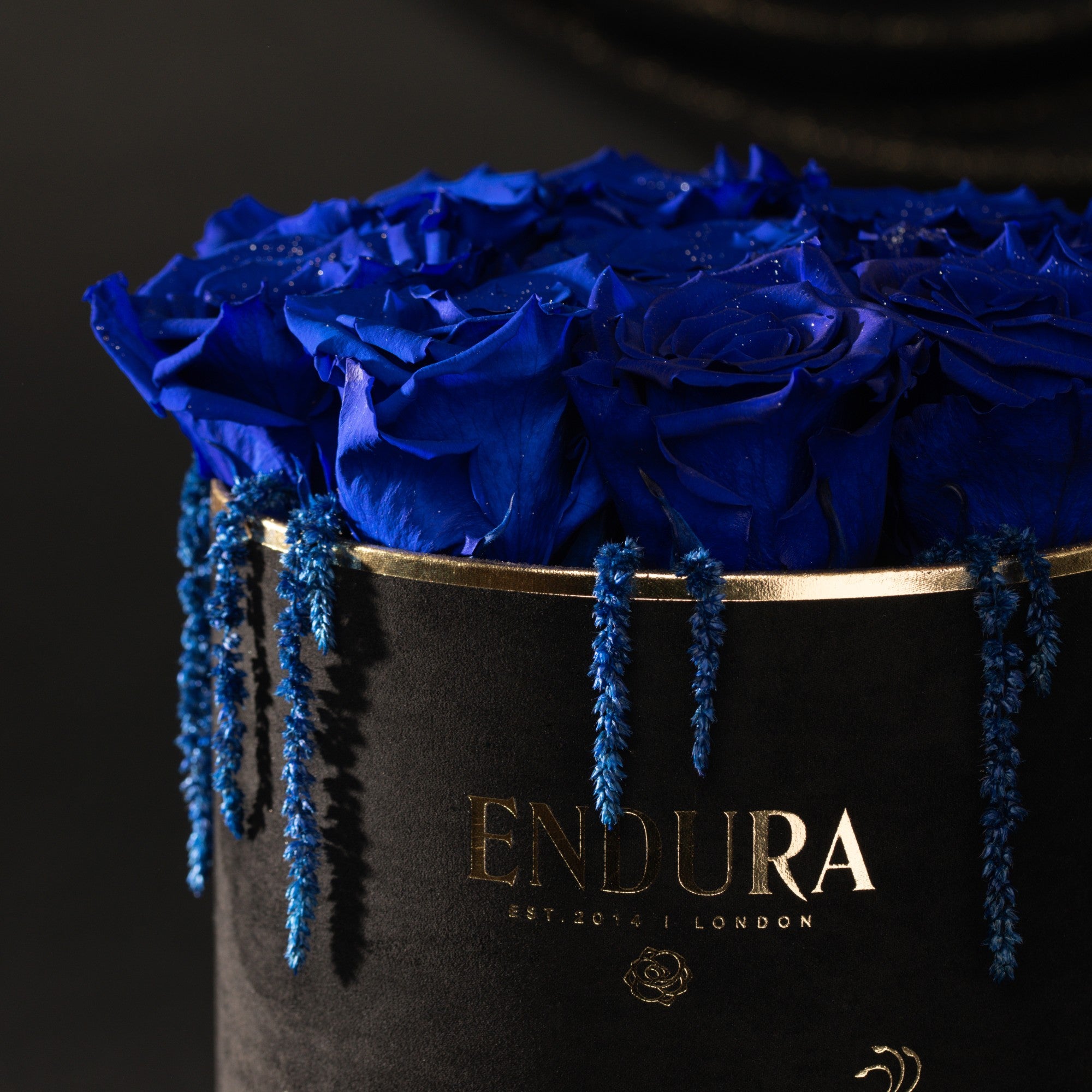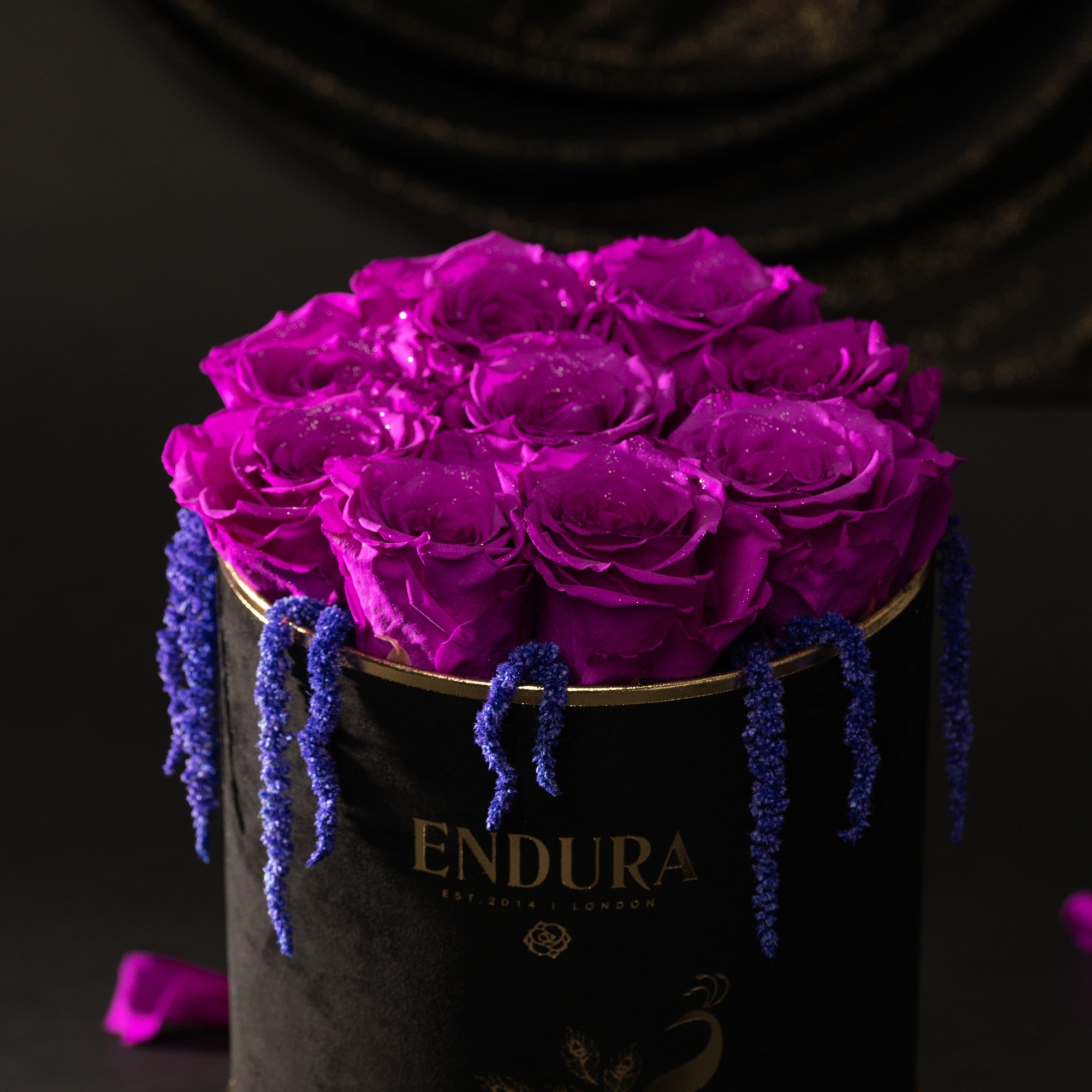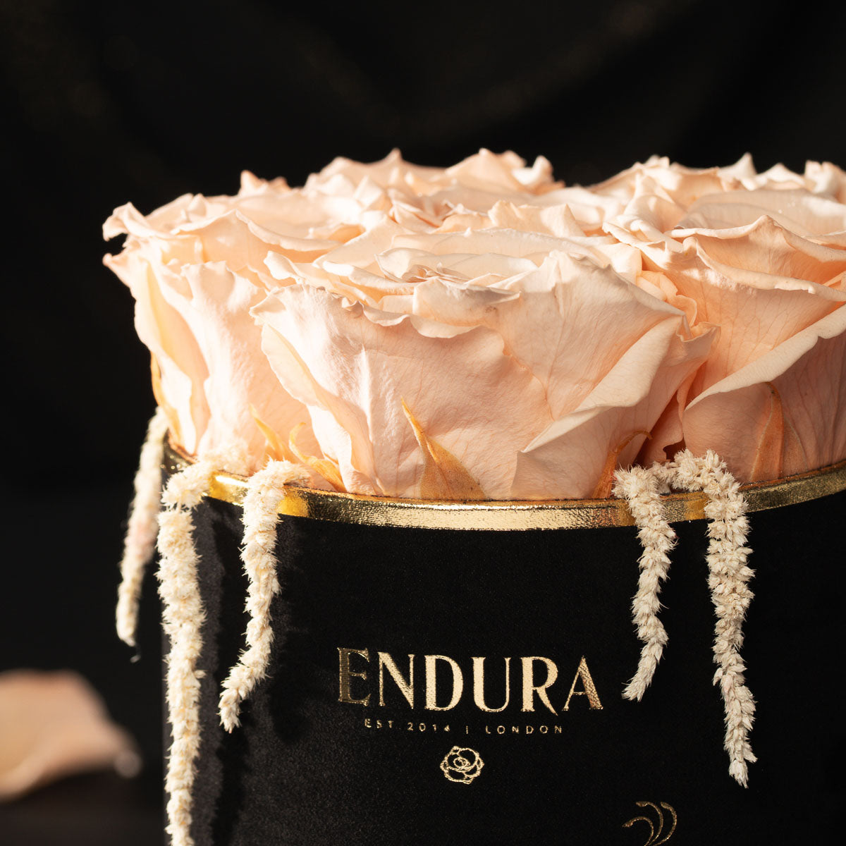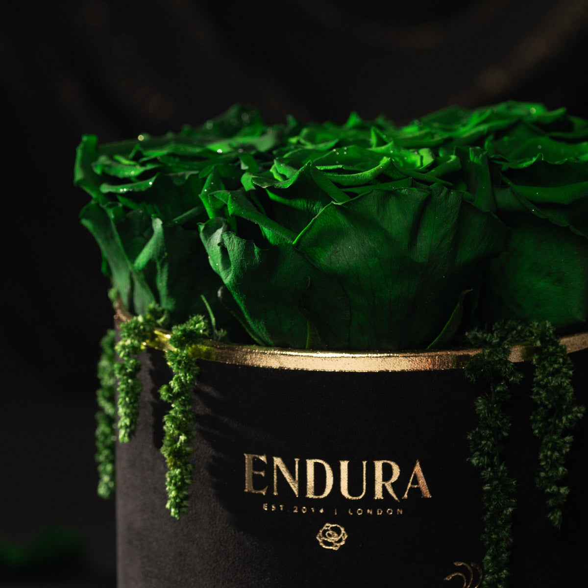 Endura Bloom is elegantly presented in a sumptuous velvet-textured box, within lies a curated selection of exquisite natural roses, each meticulously preserved to perfection and offered in an array of captivating shades. A symbol of timeless beauty and refinement; every bloom embodies artistry and precision, retaining its natural beauty for up to three years.
