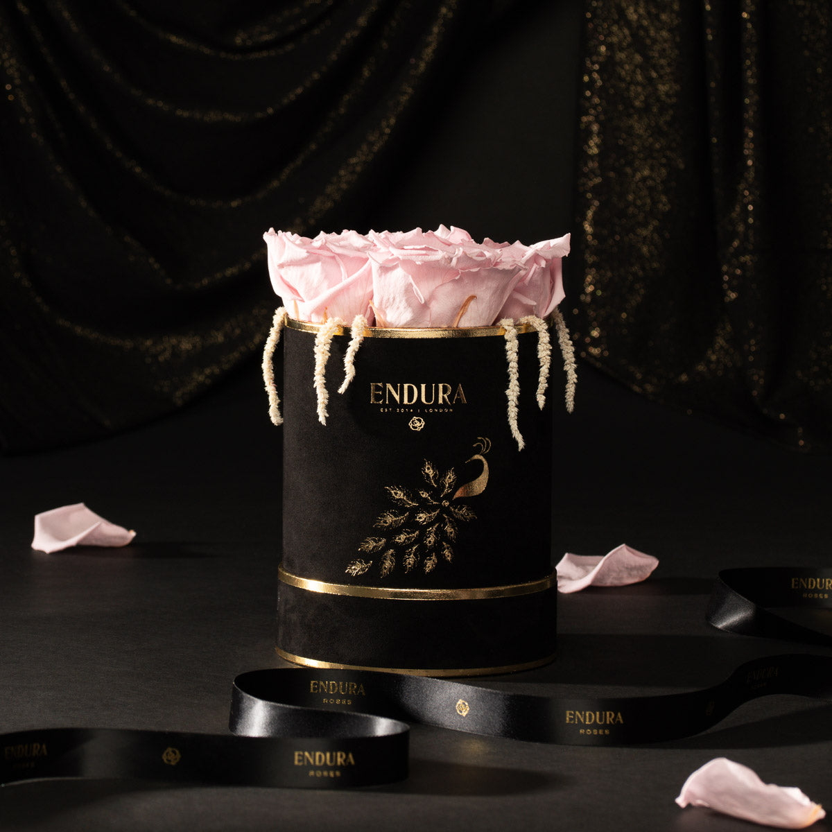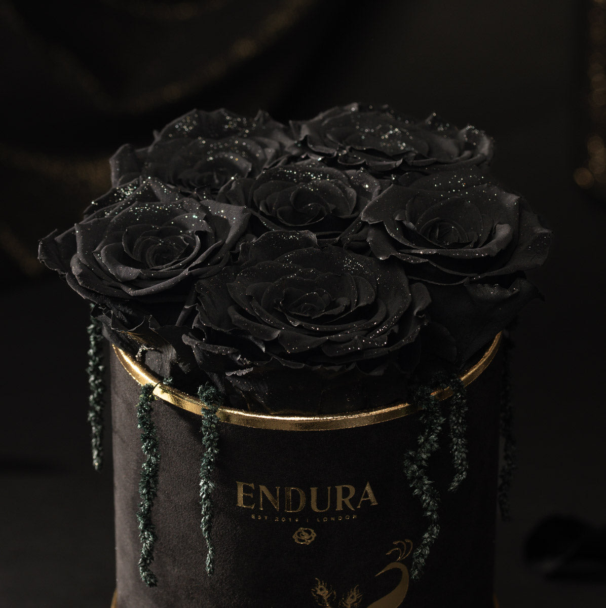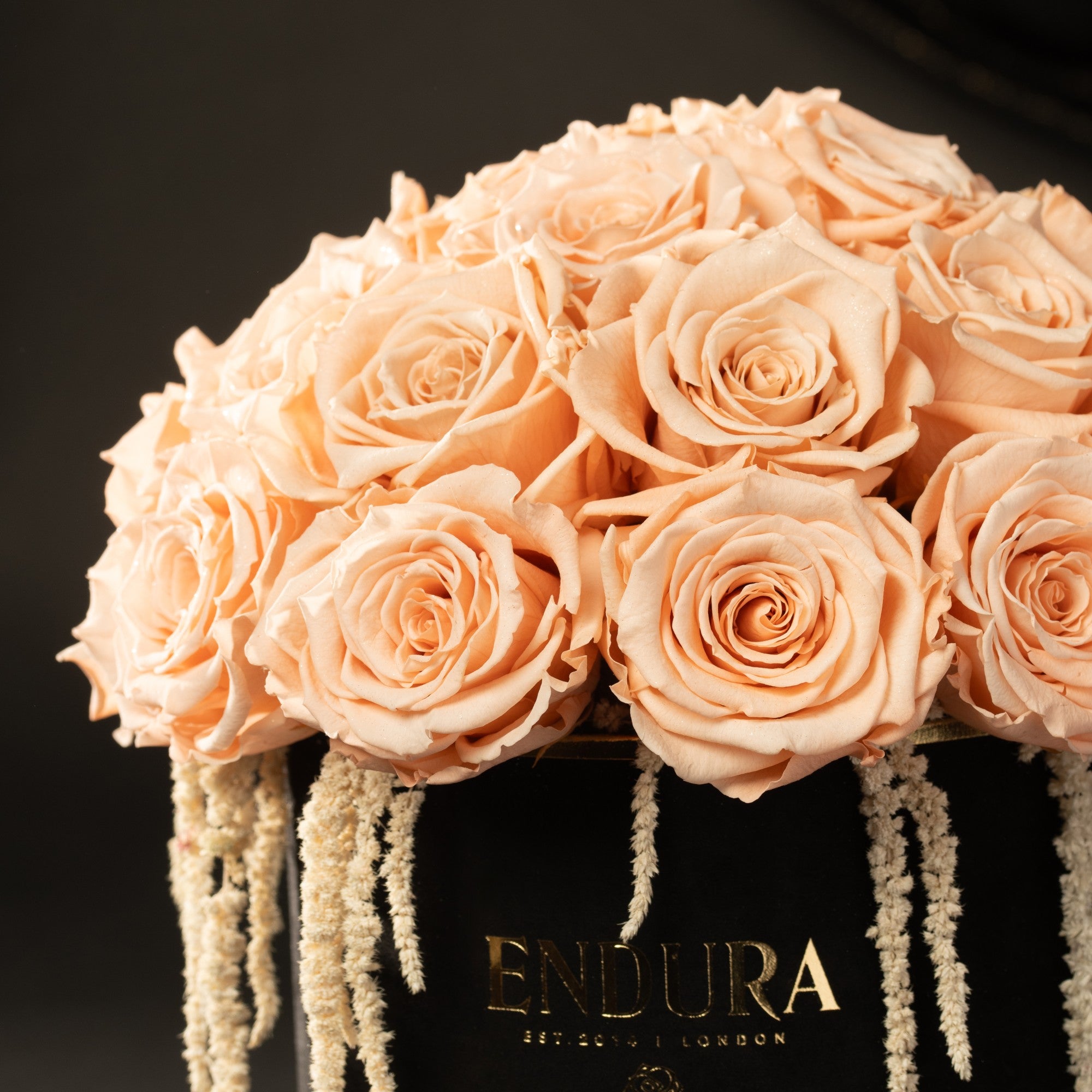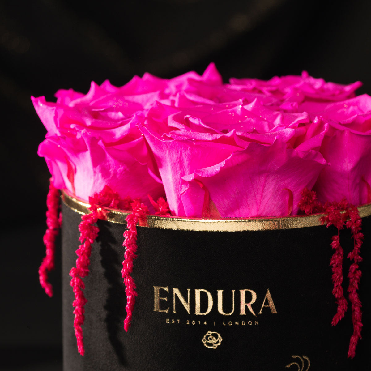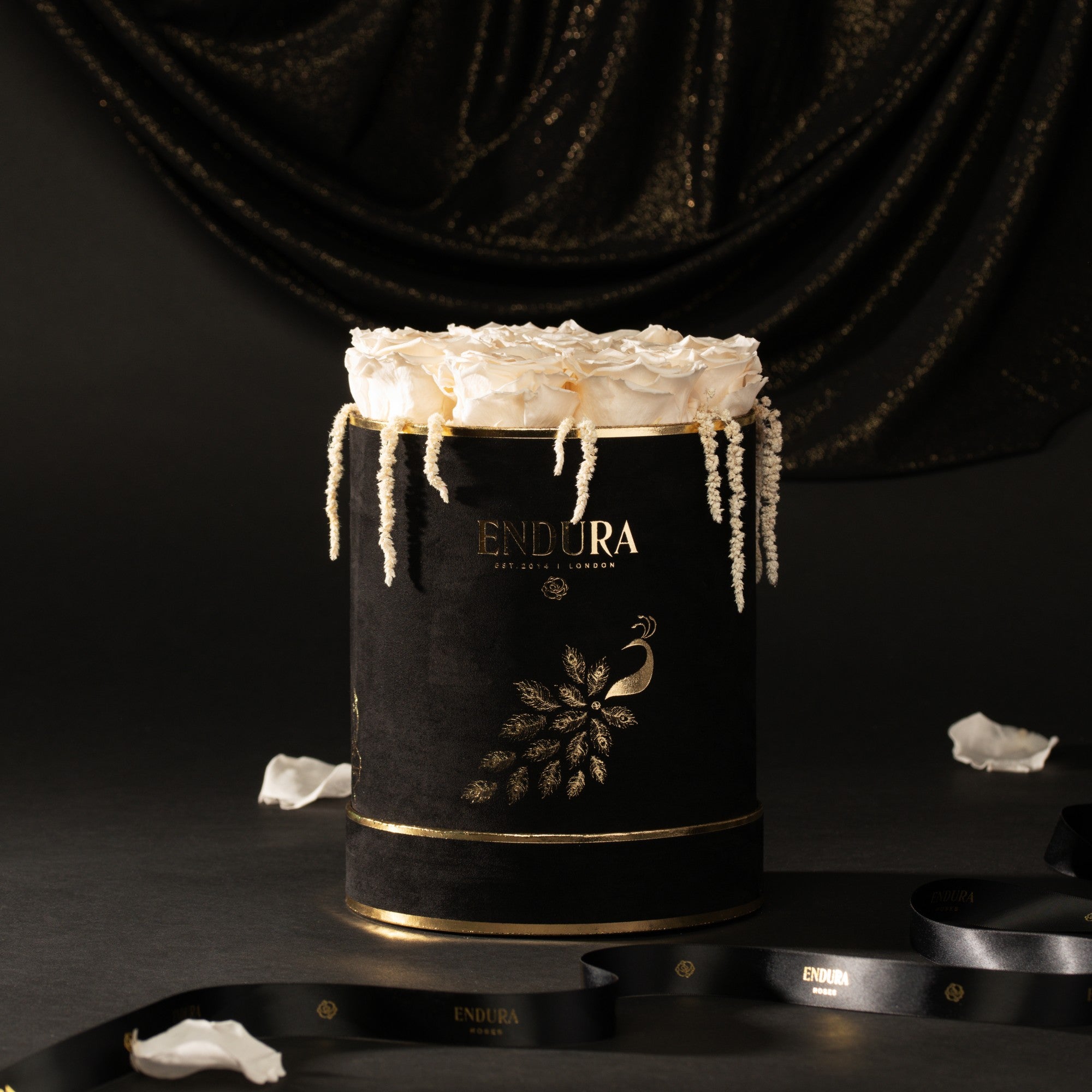 Endura Bloom is elegantly presented in a sumptuous velvet-textured box, within lies a curated selection of exquisite natural roses, each meticulously preserved to perfection and offered in an array of captivating shades. A symbol of timeless beauty and refinement; every bloom embodies artistry and precision, retaining its natural beauty for up to three years.