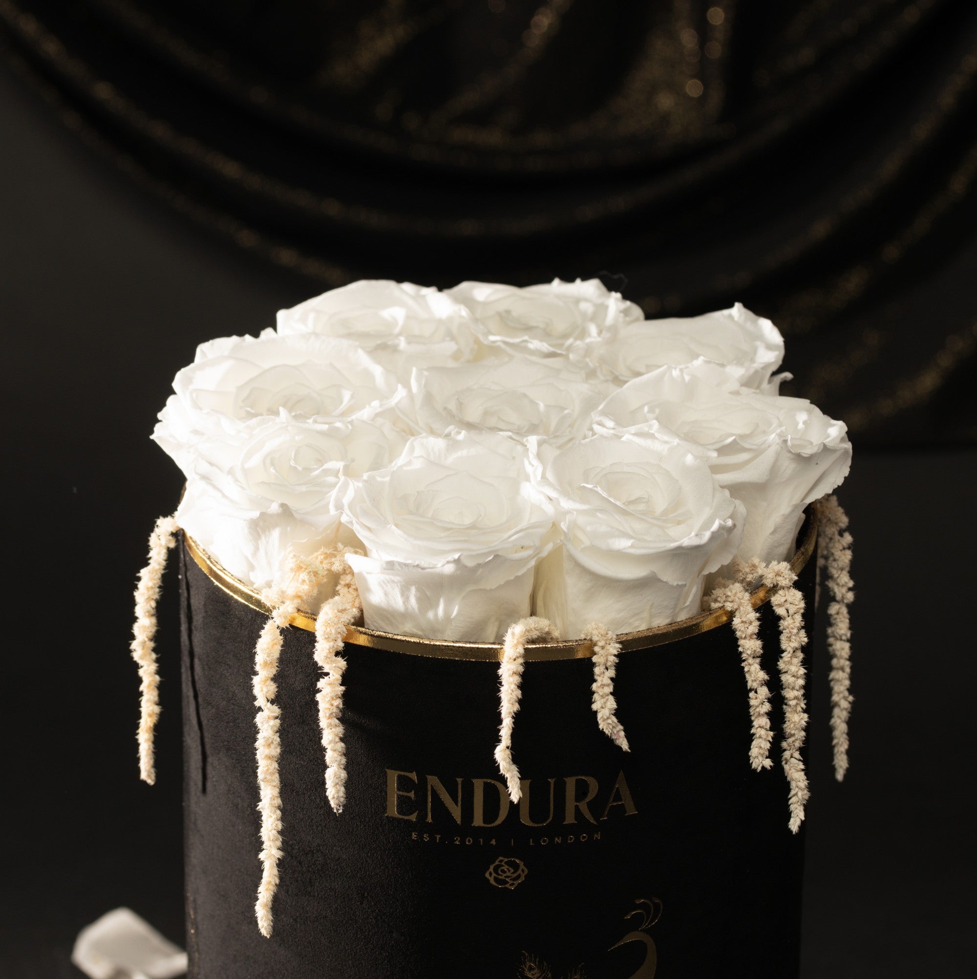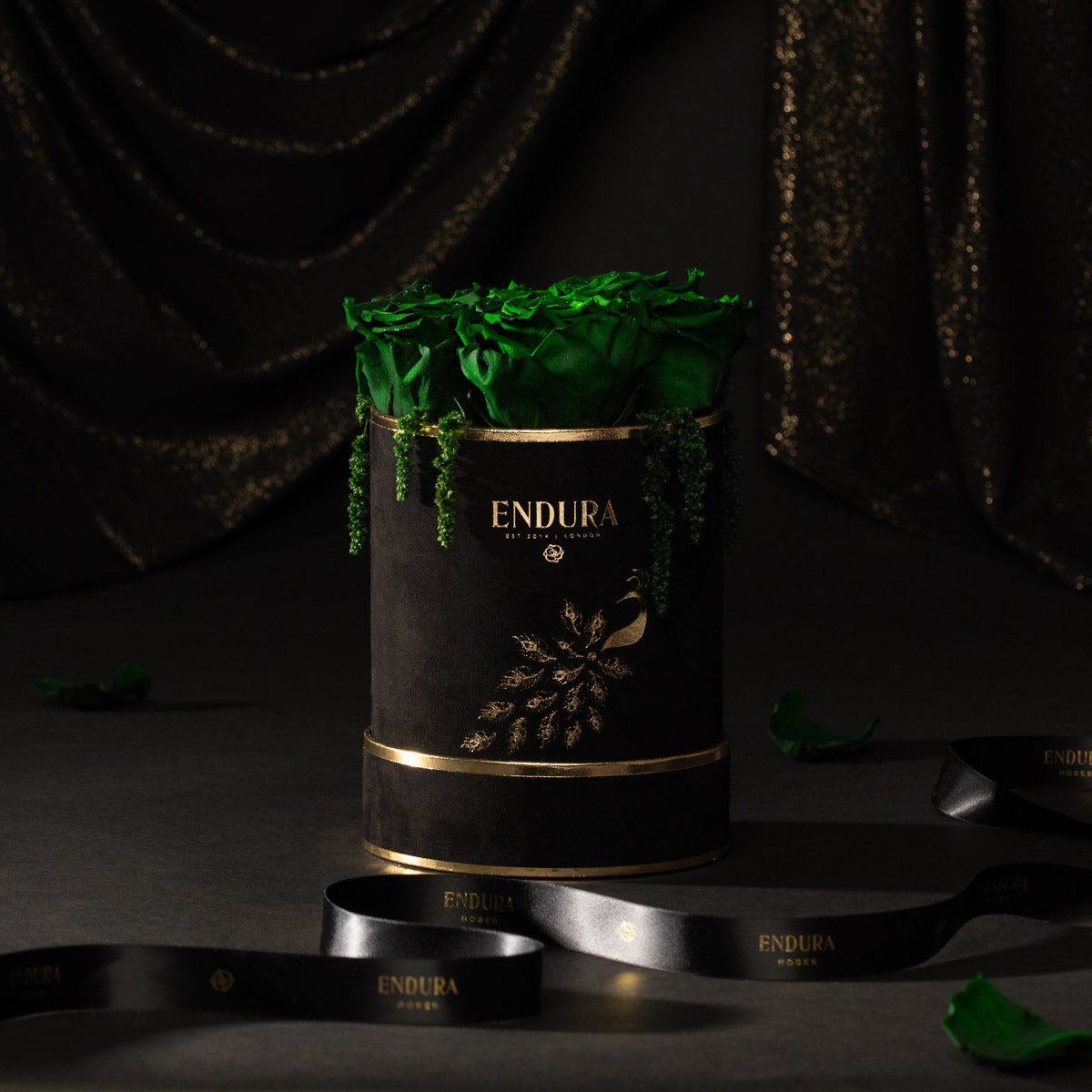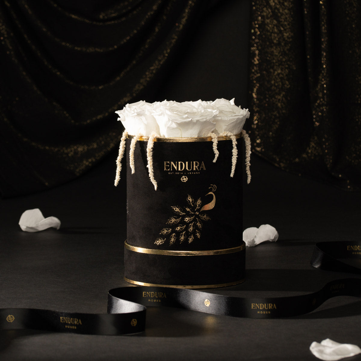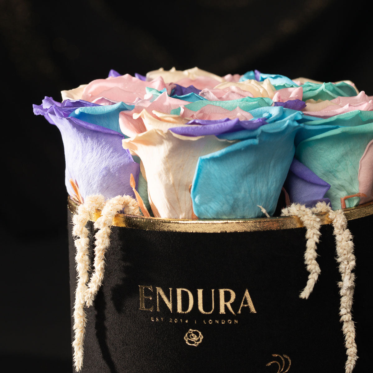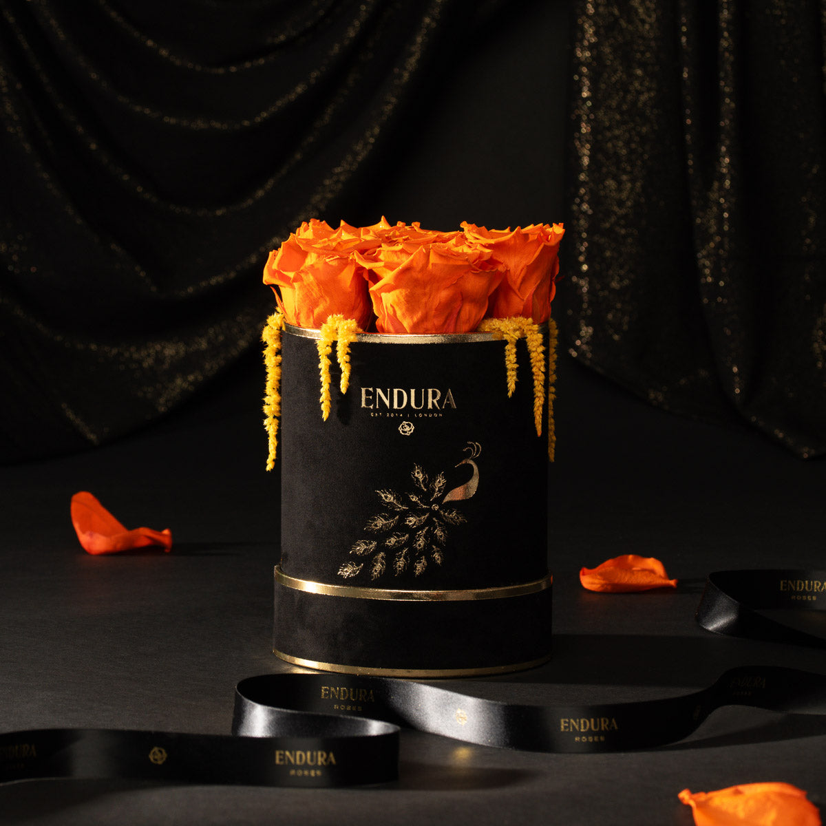 Endura Bloom is elegantly presented in a sumptuous velvet-textured box, within lies a curated selection of exquisite natural roses, each meticulously preserved to perfection and offered in an array of captivating shades. A symbol of timeless beauty and refinement; every bloom embodies artistry and precision, retaining its natural beauty for up to three years.