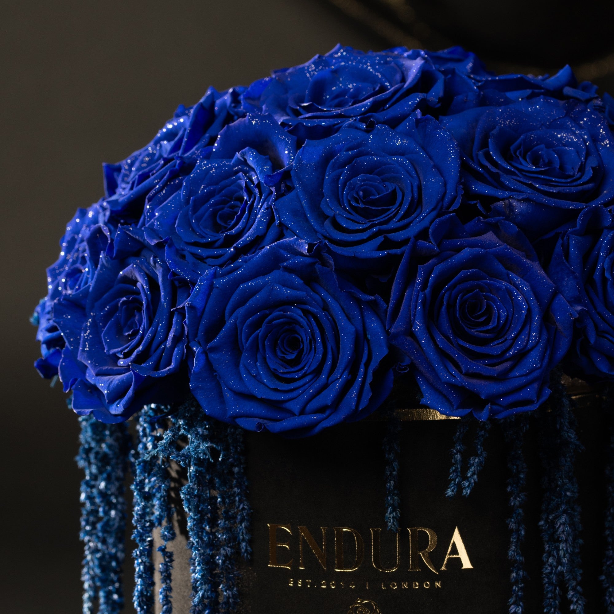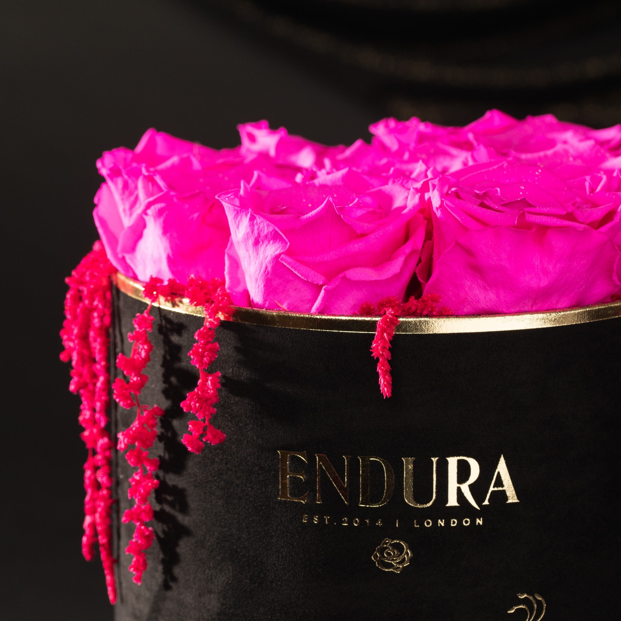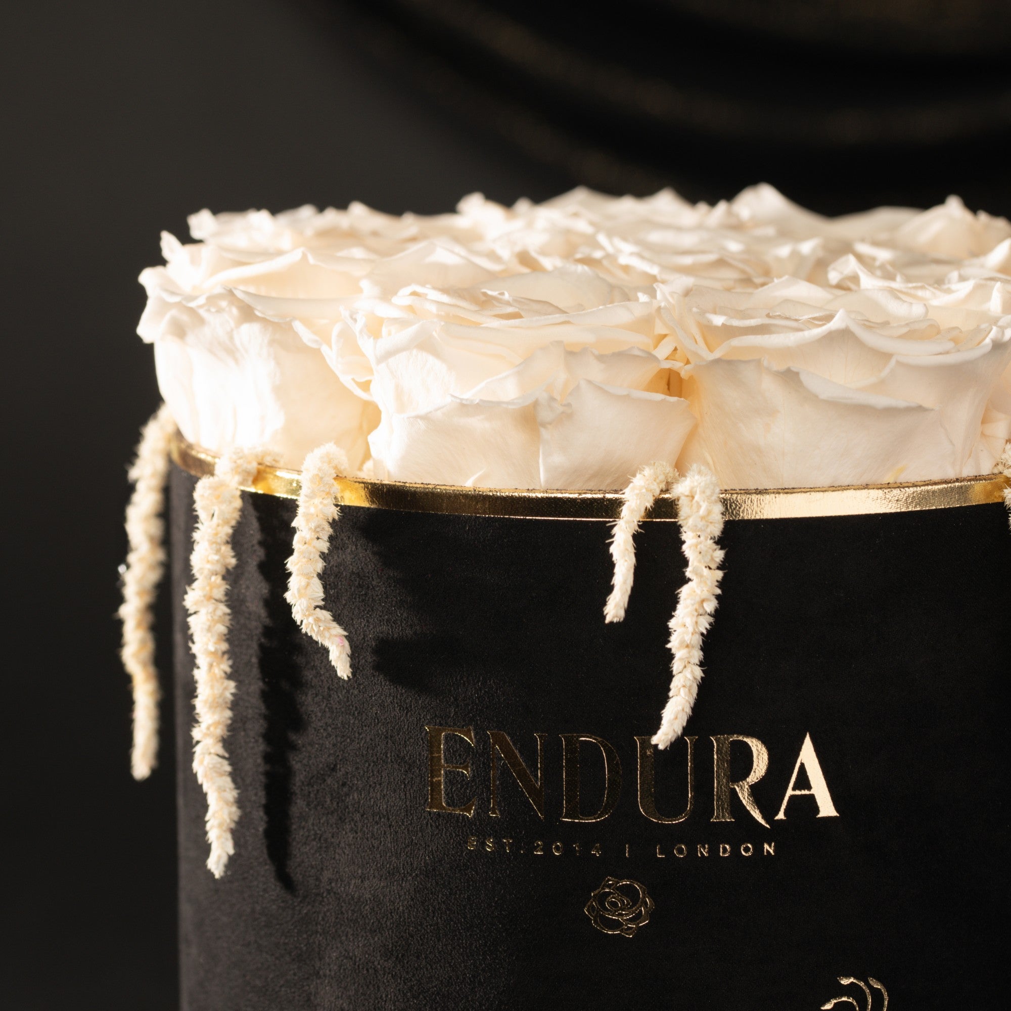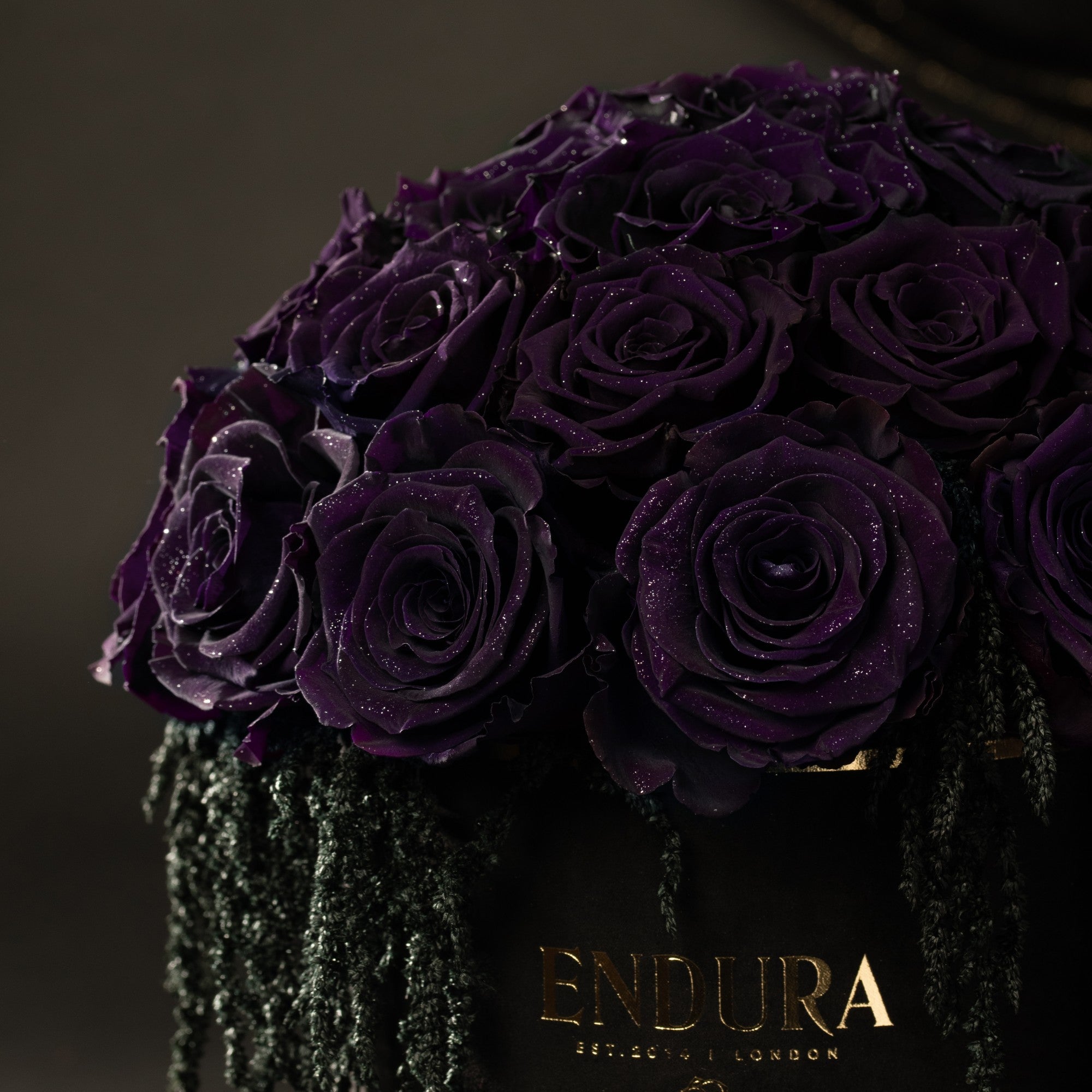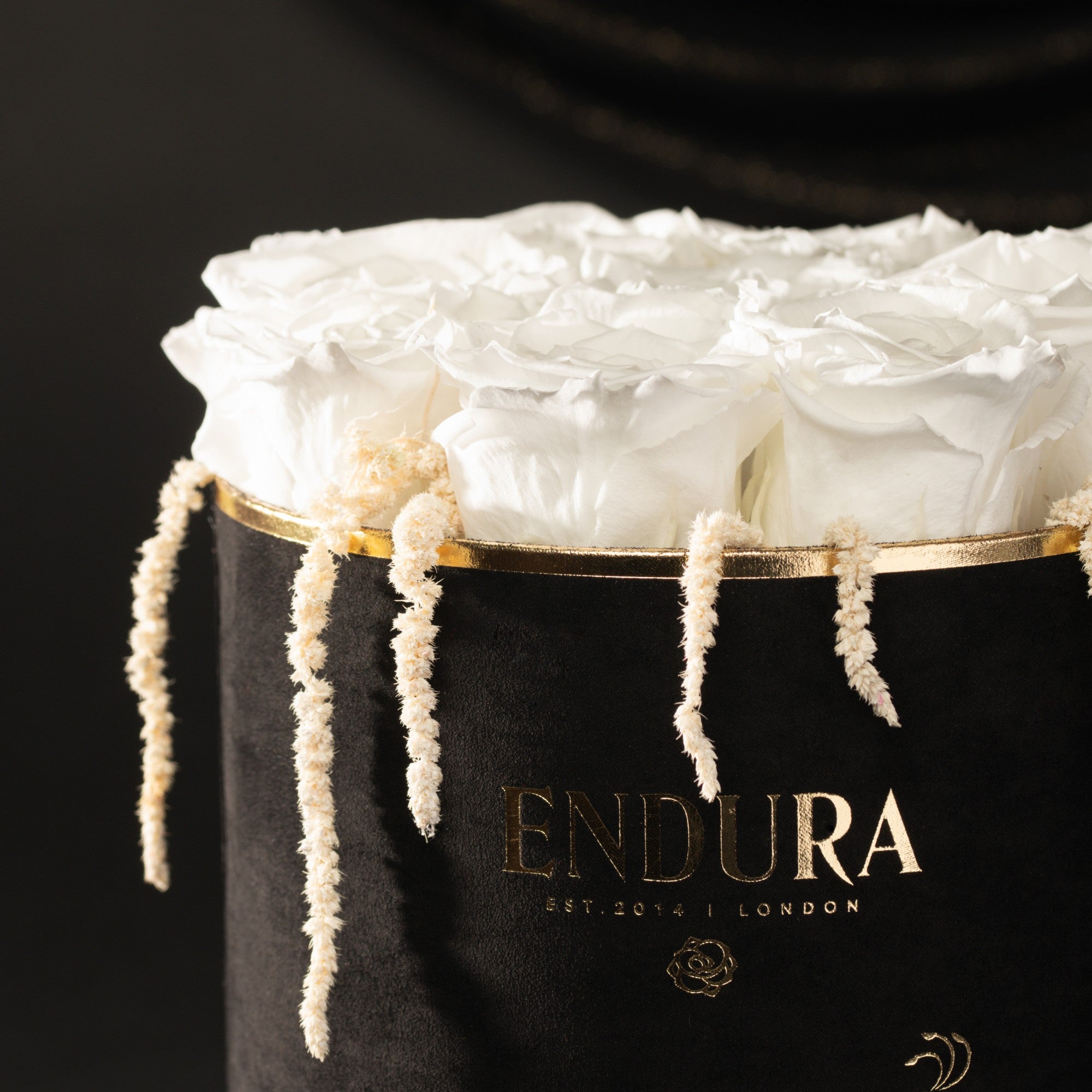 Endura Bloom is elegantly presented in a sumptuous velvet-textured box, within lies a curated selection of exquisite natural roses, each meticulously preserved to perfection and offered in an array of captivating shades. A symbol of timeless beauty and refinement; every bloom embodies artistry and precision, retaining its natural beauty for up to three years.