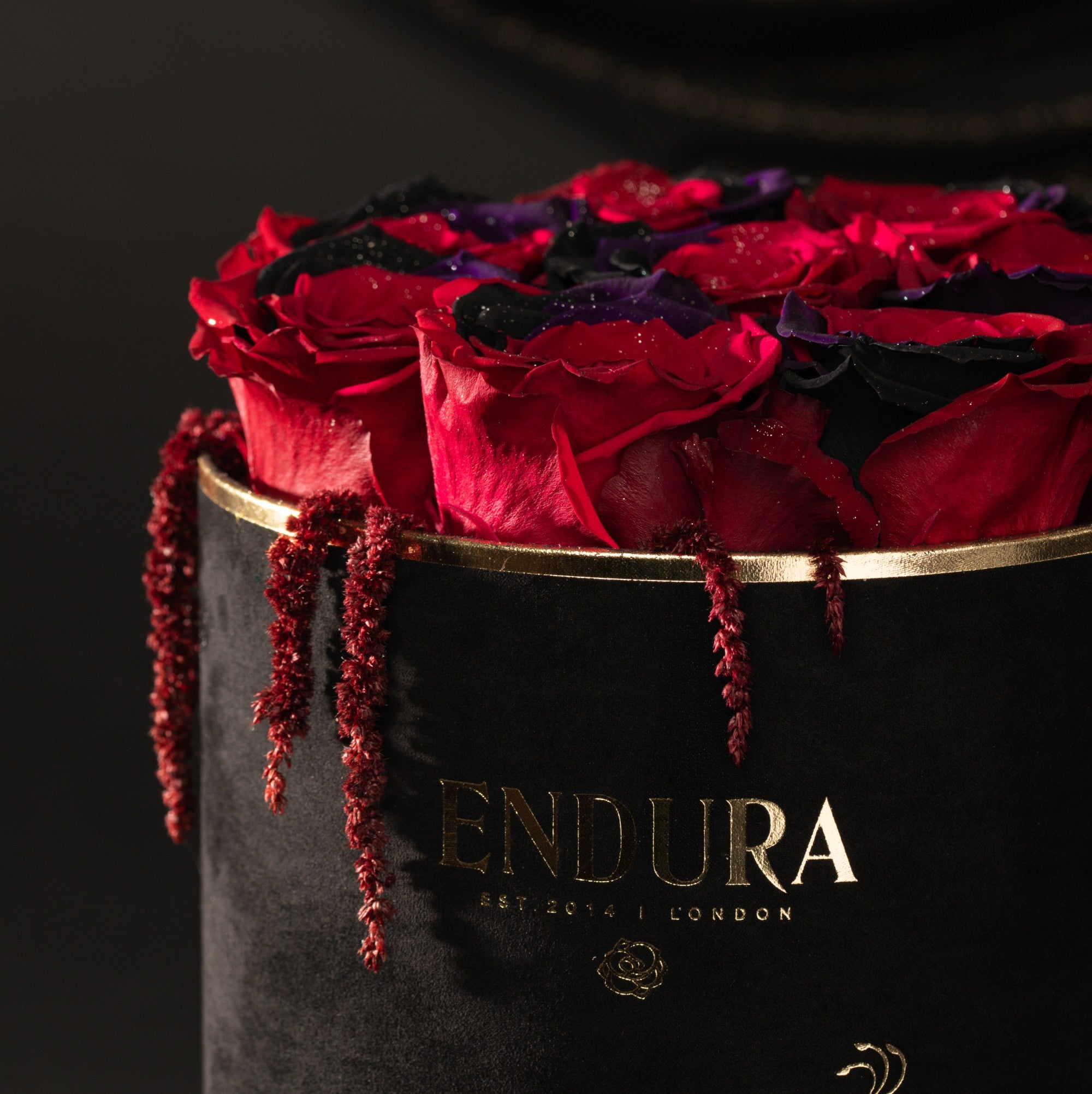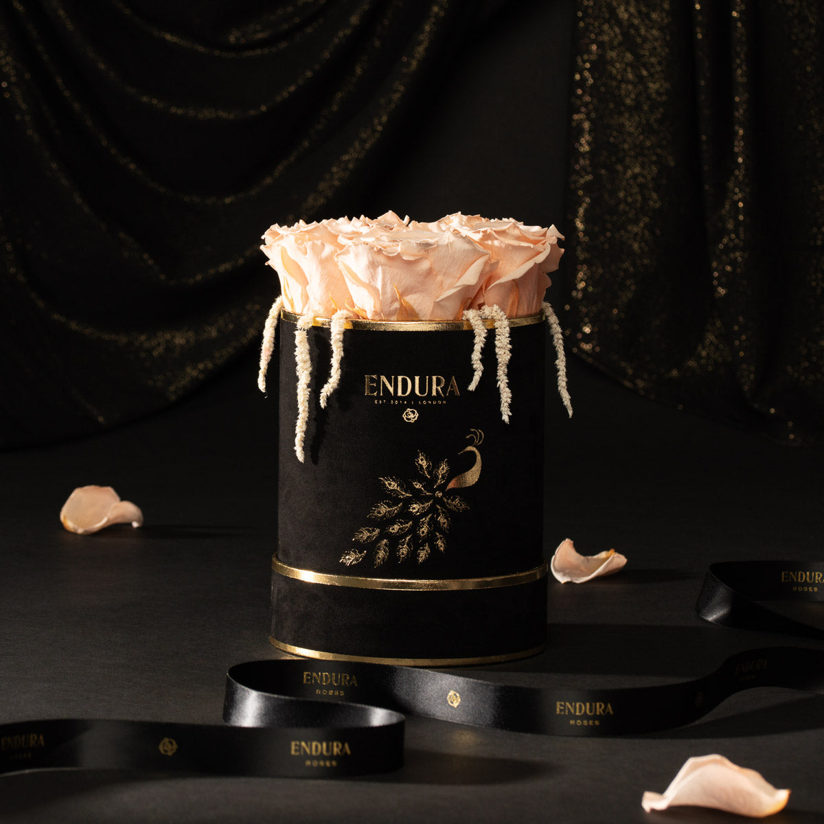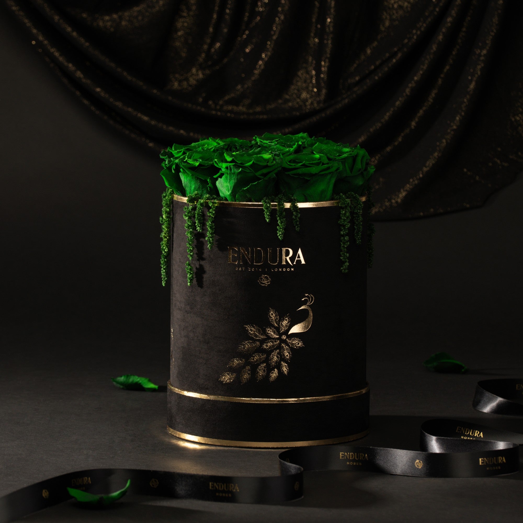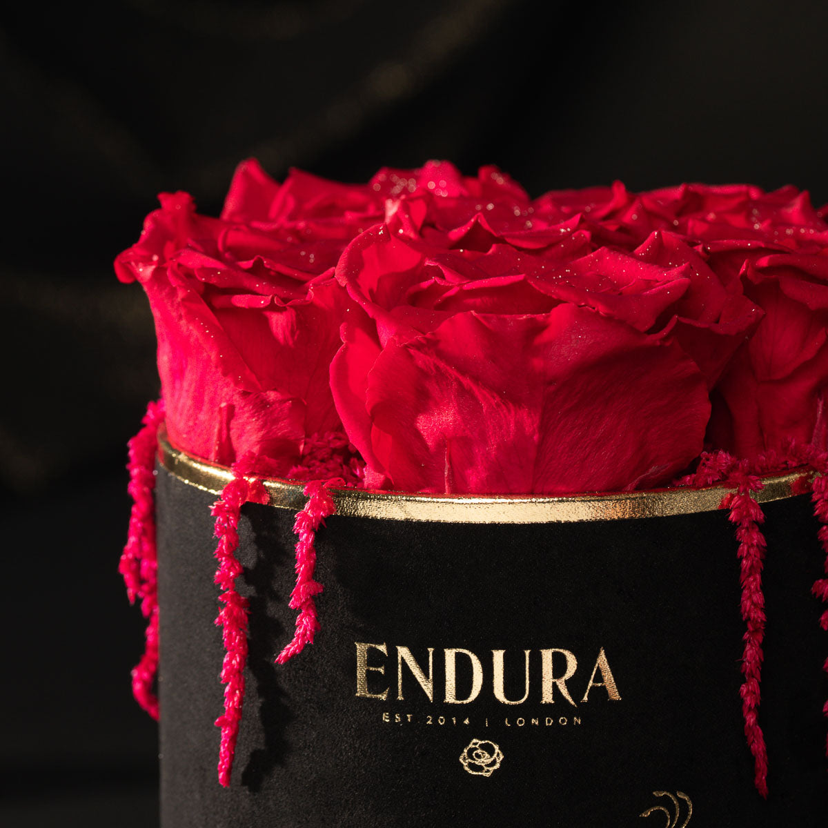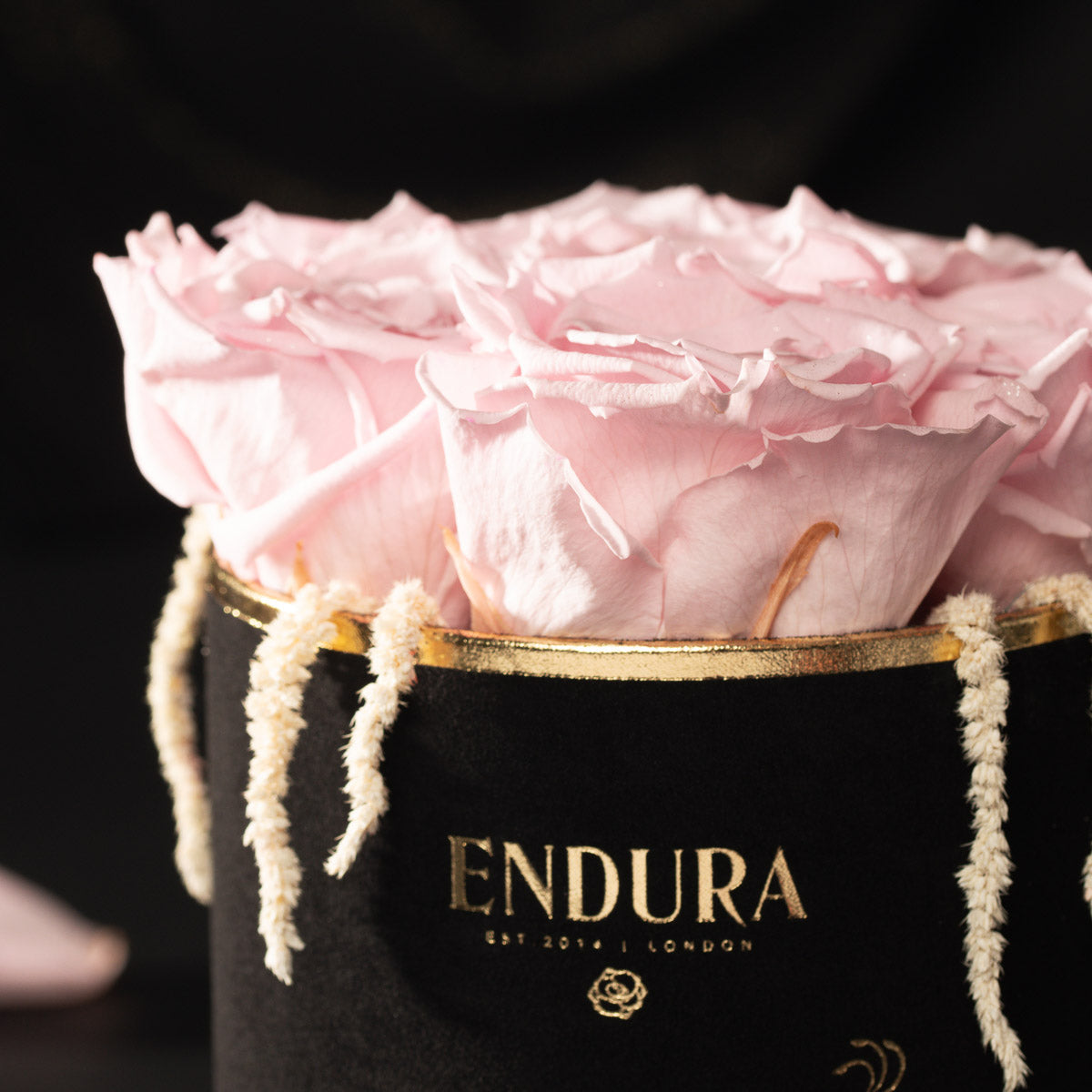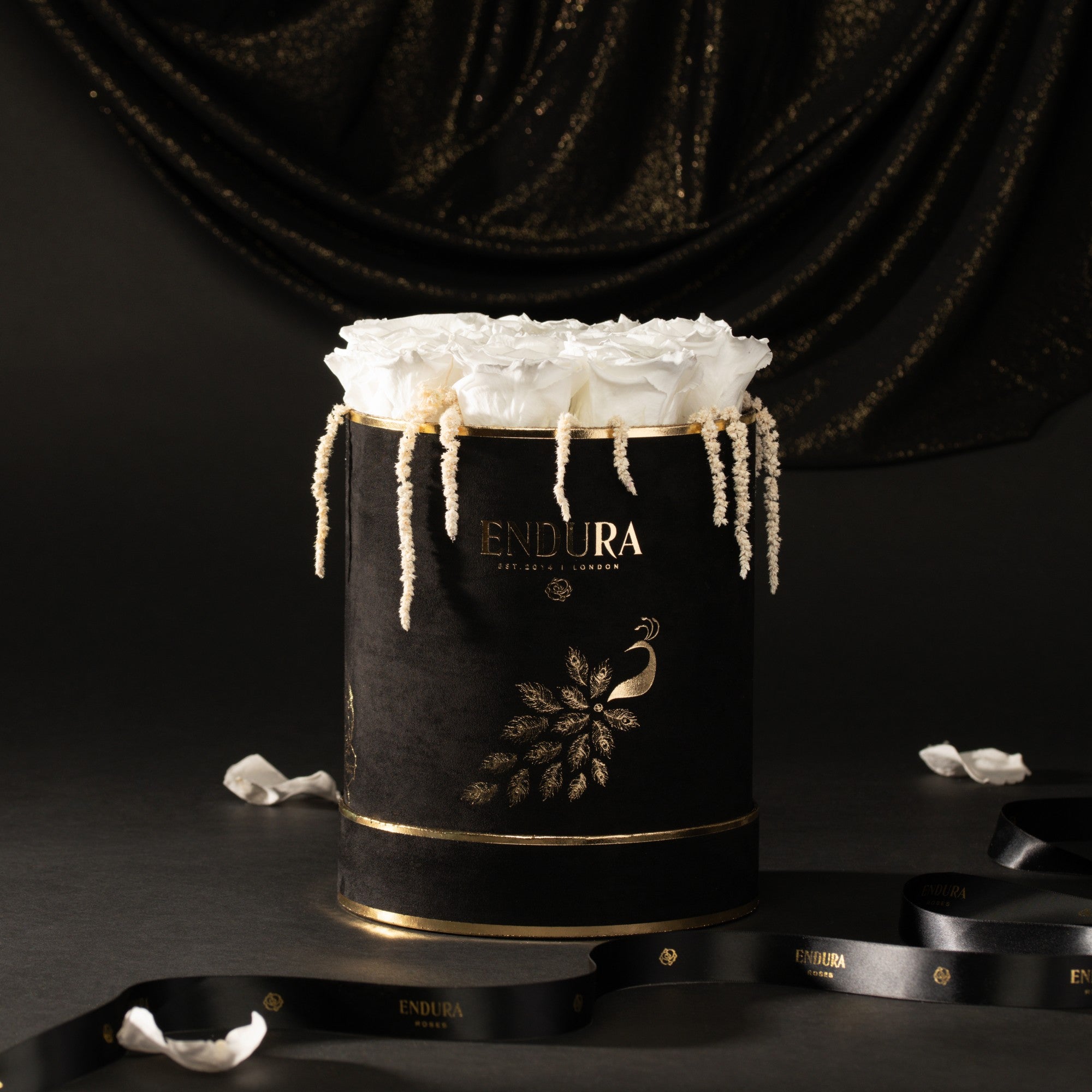 Endura Bloom is elegantly presented in a sumptuous velvet-textured box, within lies a curated selection of exquisite natural roses, each meticulously preserved to perfection and offered in an array of captivating shades. A symbol of timeless beauty and refinement; every bloom embodies artistry and precision, retaining its natural beauty for up to three years.