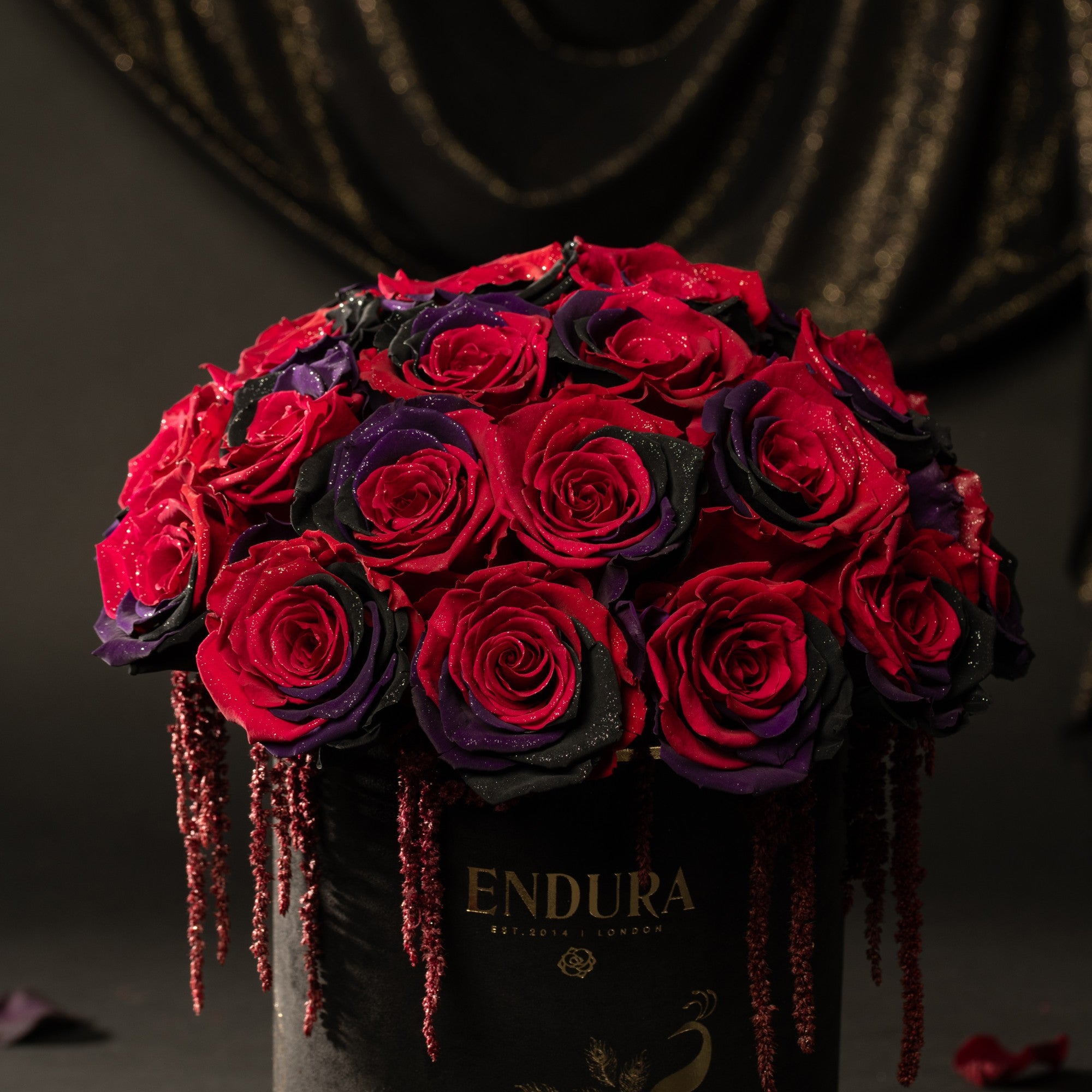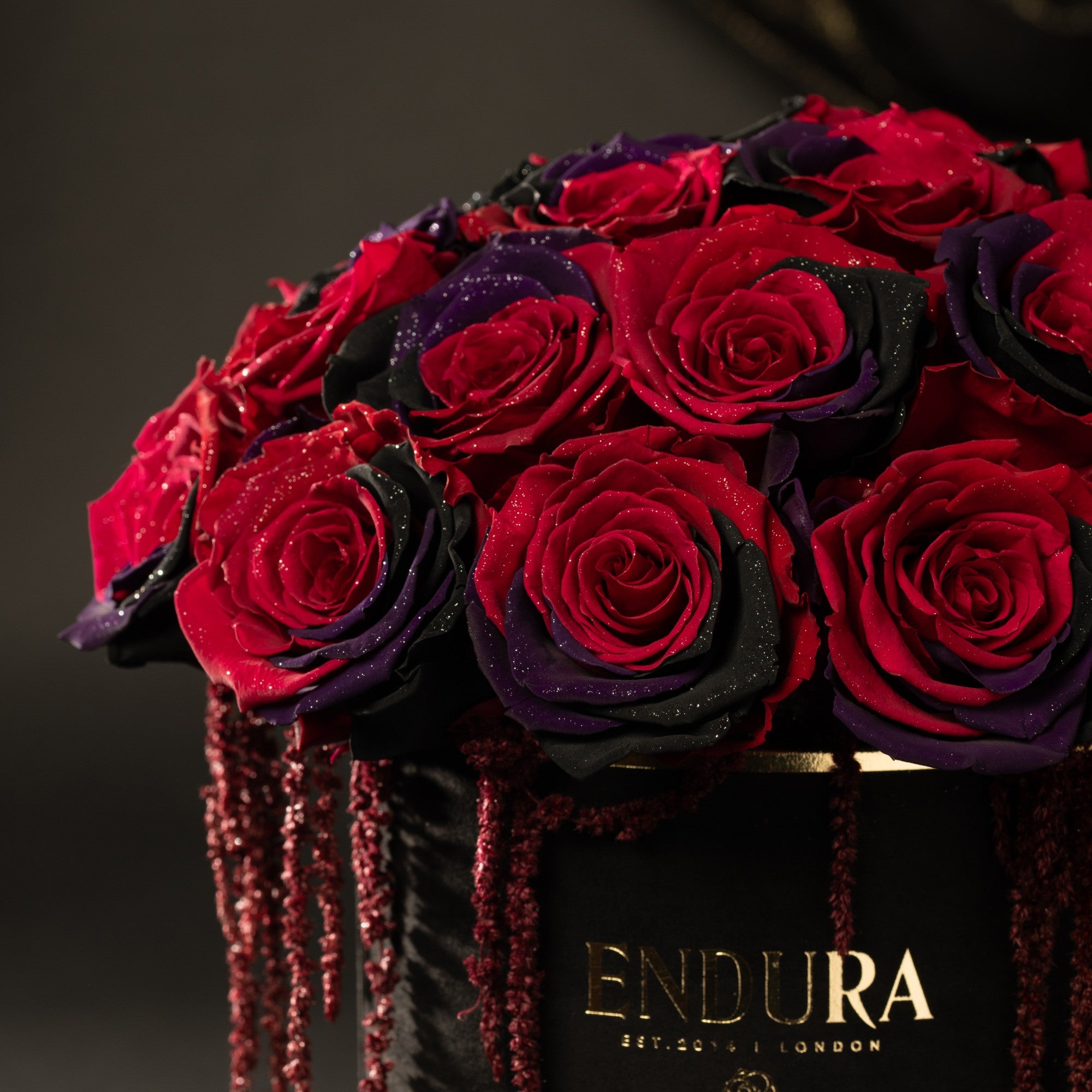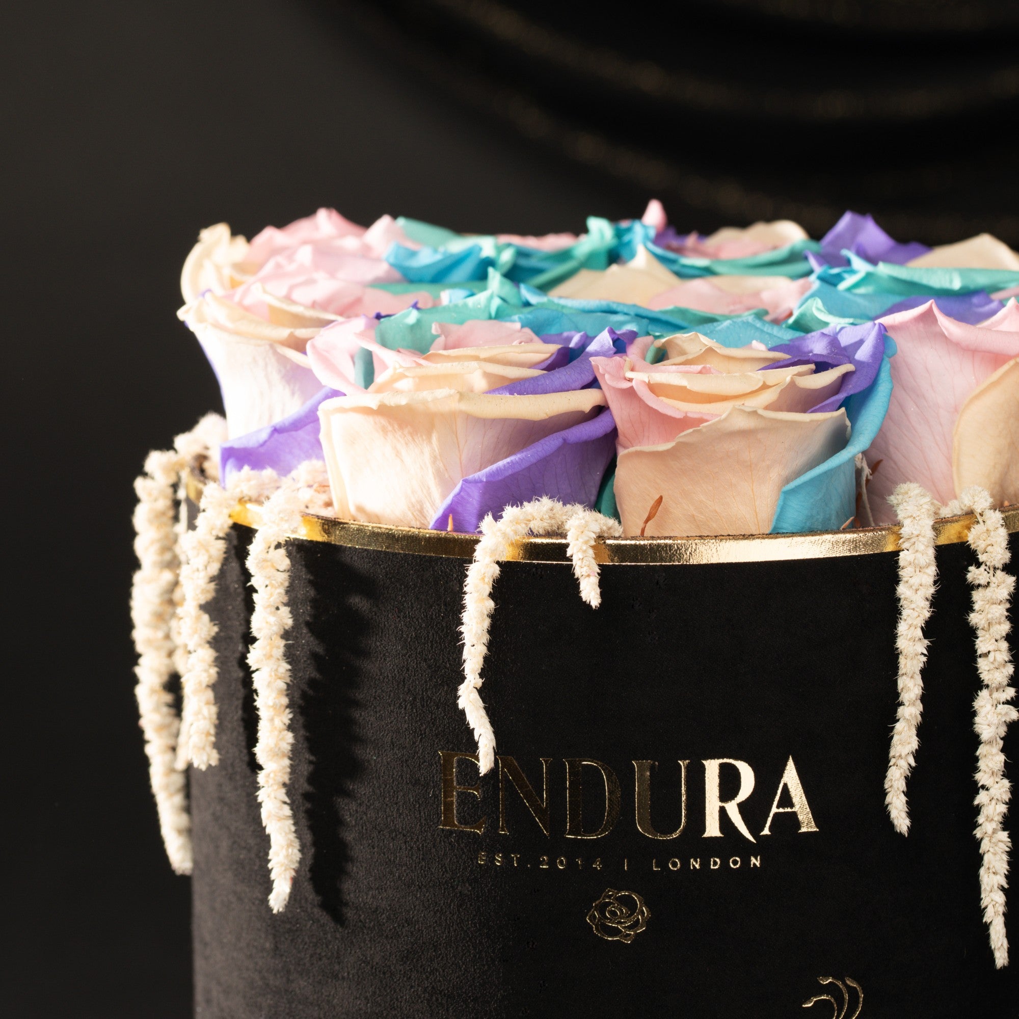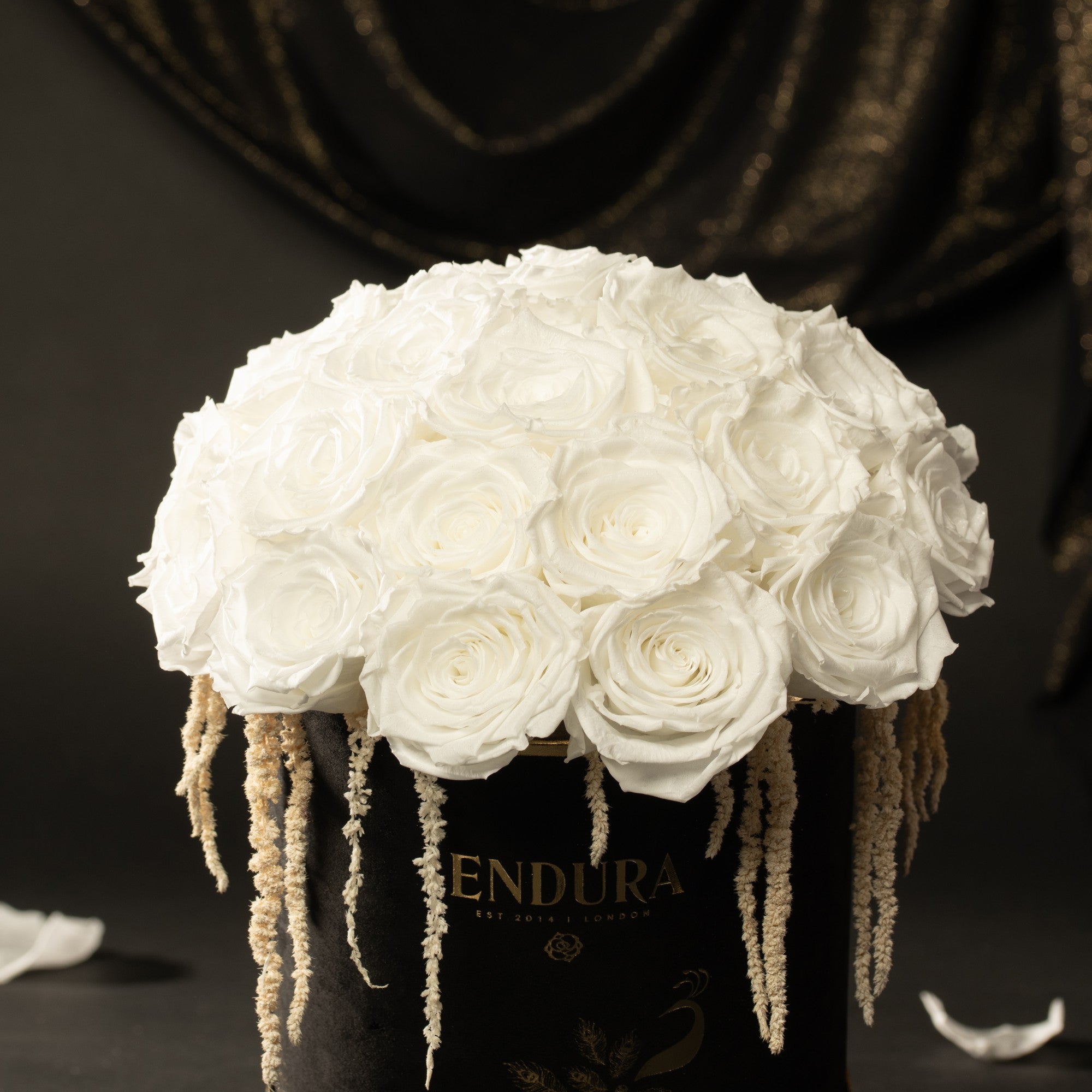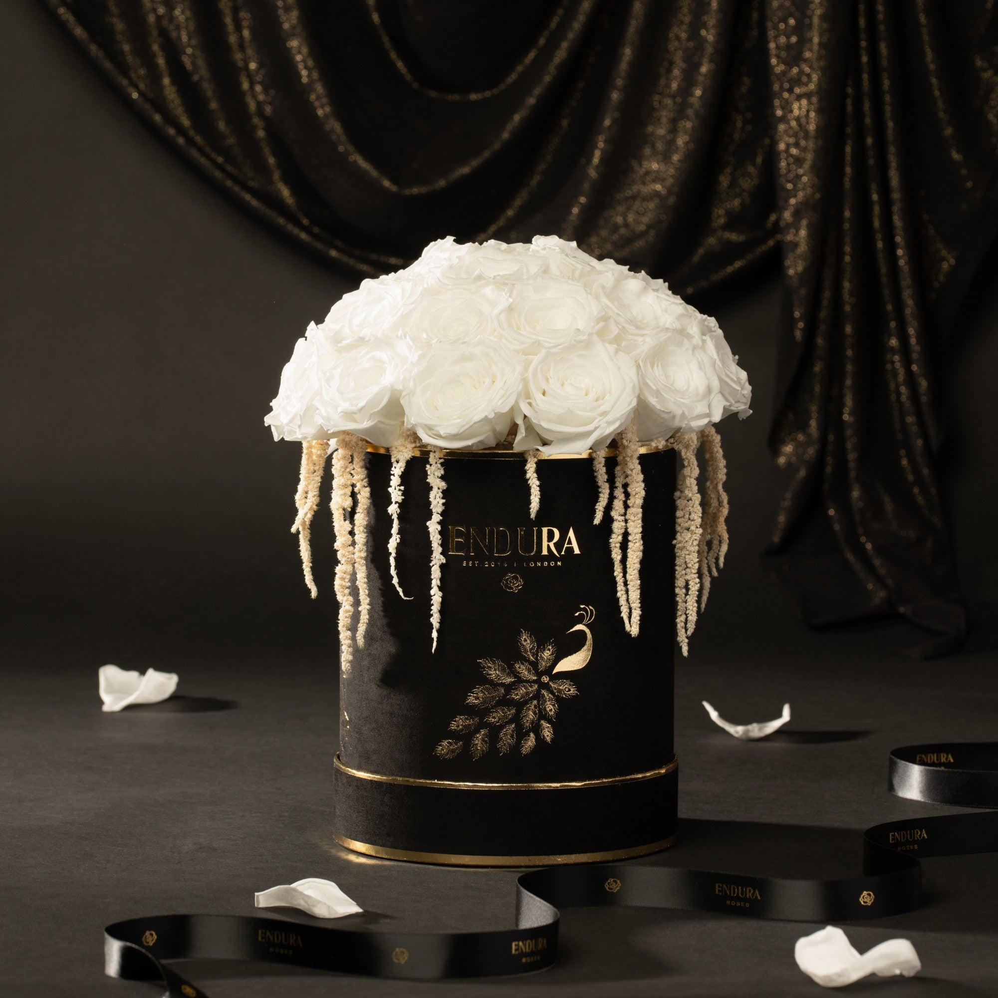 Endura Bloom is elegantly presented in a sumptuous velvet-textured box, within lies a curated selection of exquisite natural roses, each meticulously preserved to perfection and offered in an array of captivating shades. A symbol of timeless beauty and refinement; every bloom embodies artistry and precision, retaining its natural beauty for up to three years.