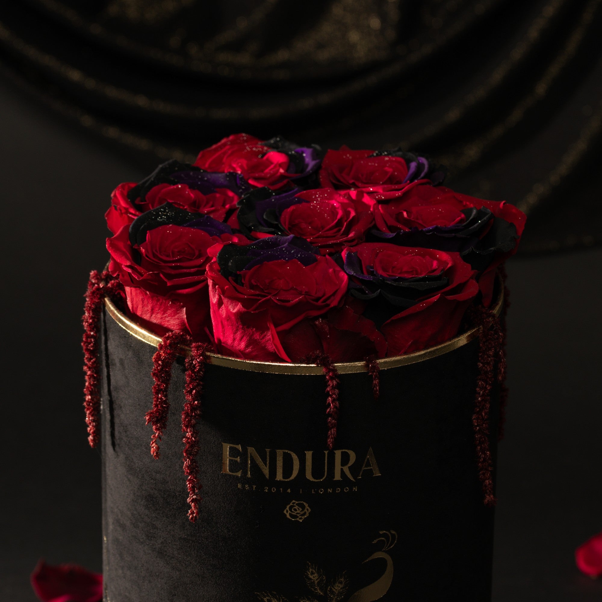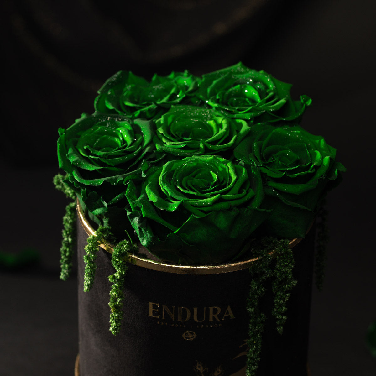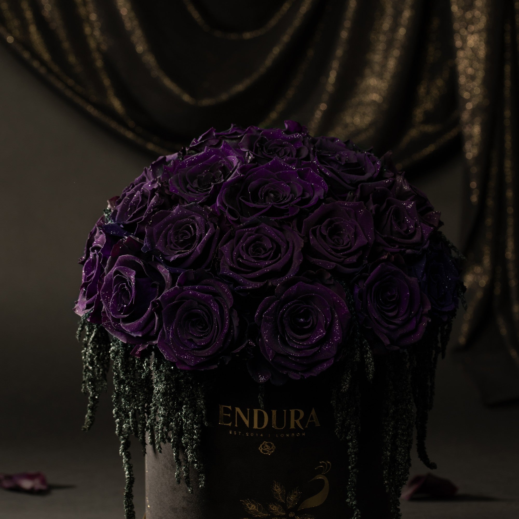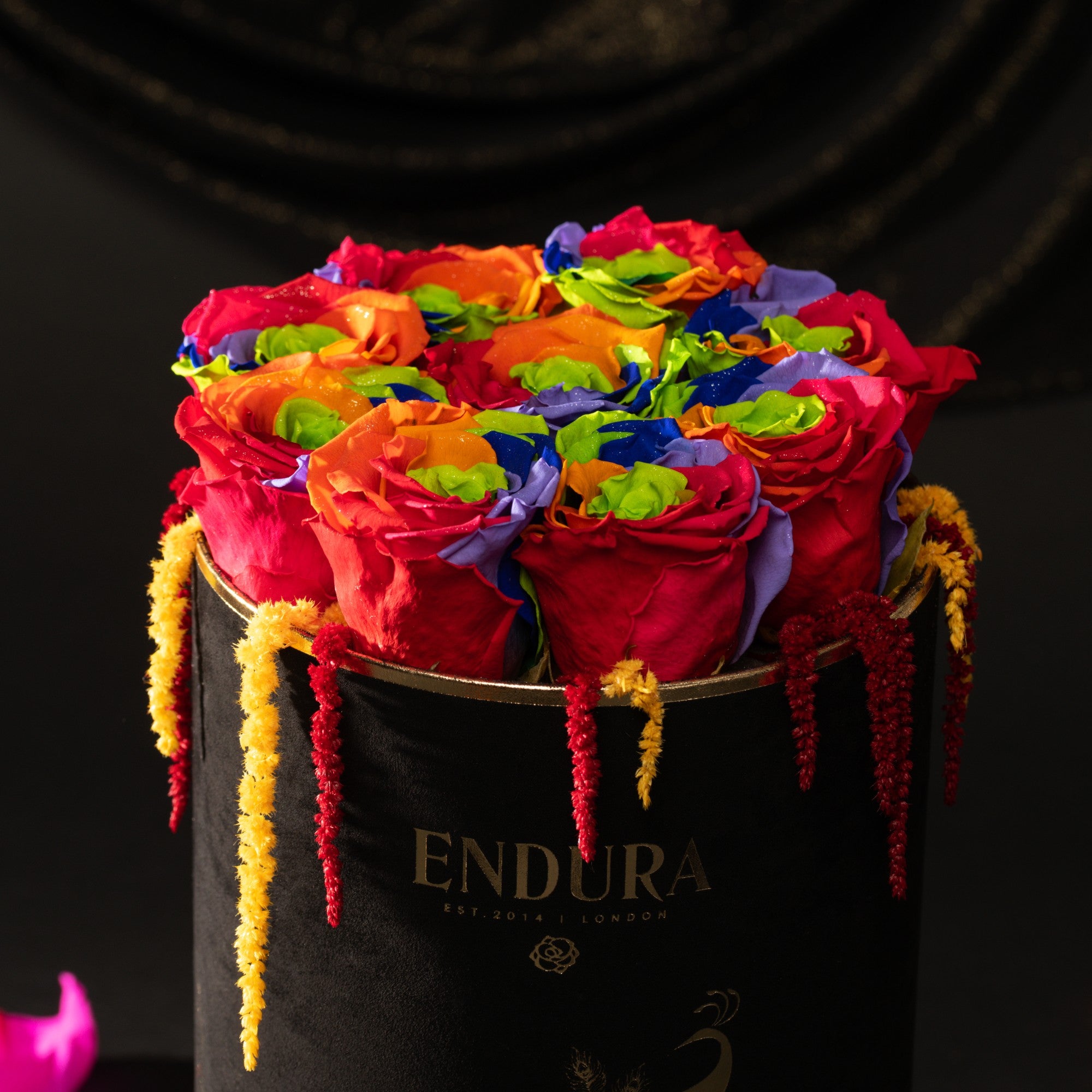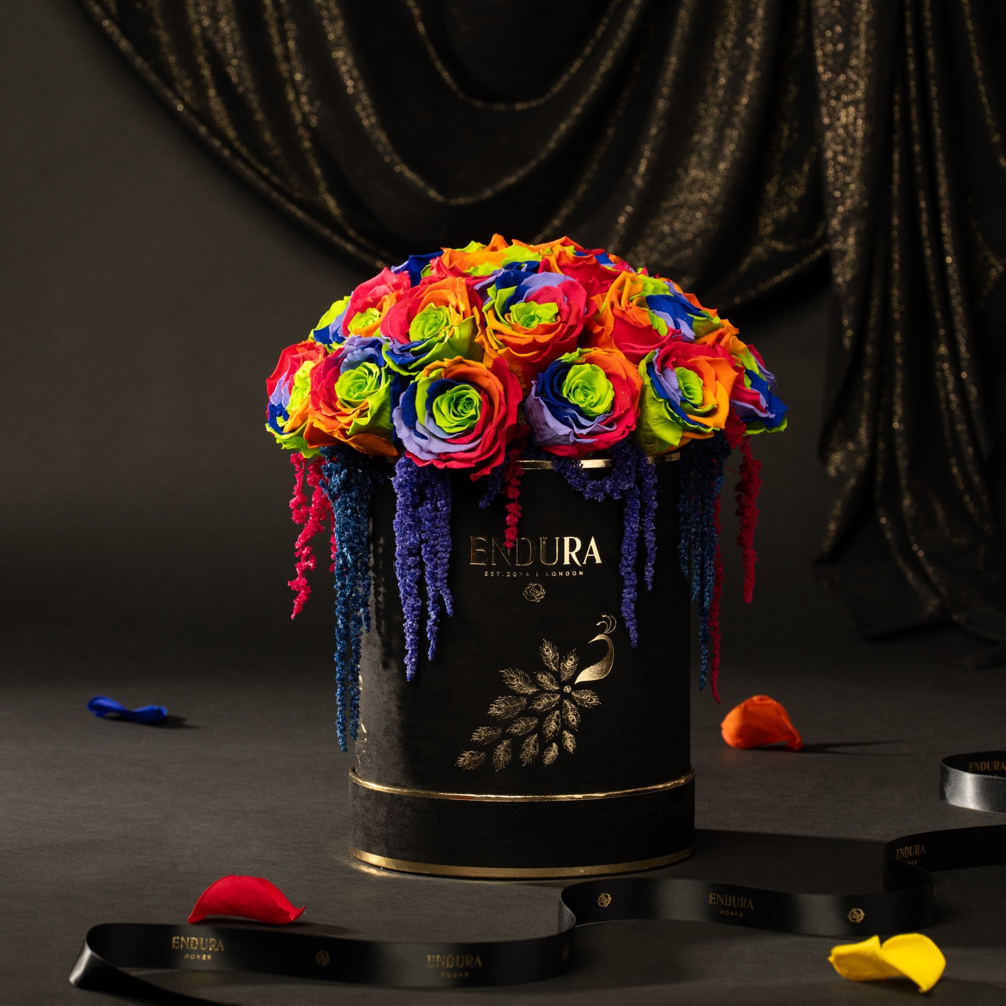 Endura Bloom is elegantly presented in a sumptuous velvet-textured box, within lies a curated selection of exquisite natural roses, each meticulously preserved to perfection and offered in an array of captivating shades. A symbol of timeless beauty and refinement; every bloom embodies artistry and precision, retaining its natural beauty for up to three years.