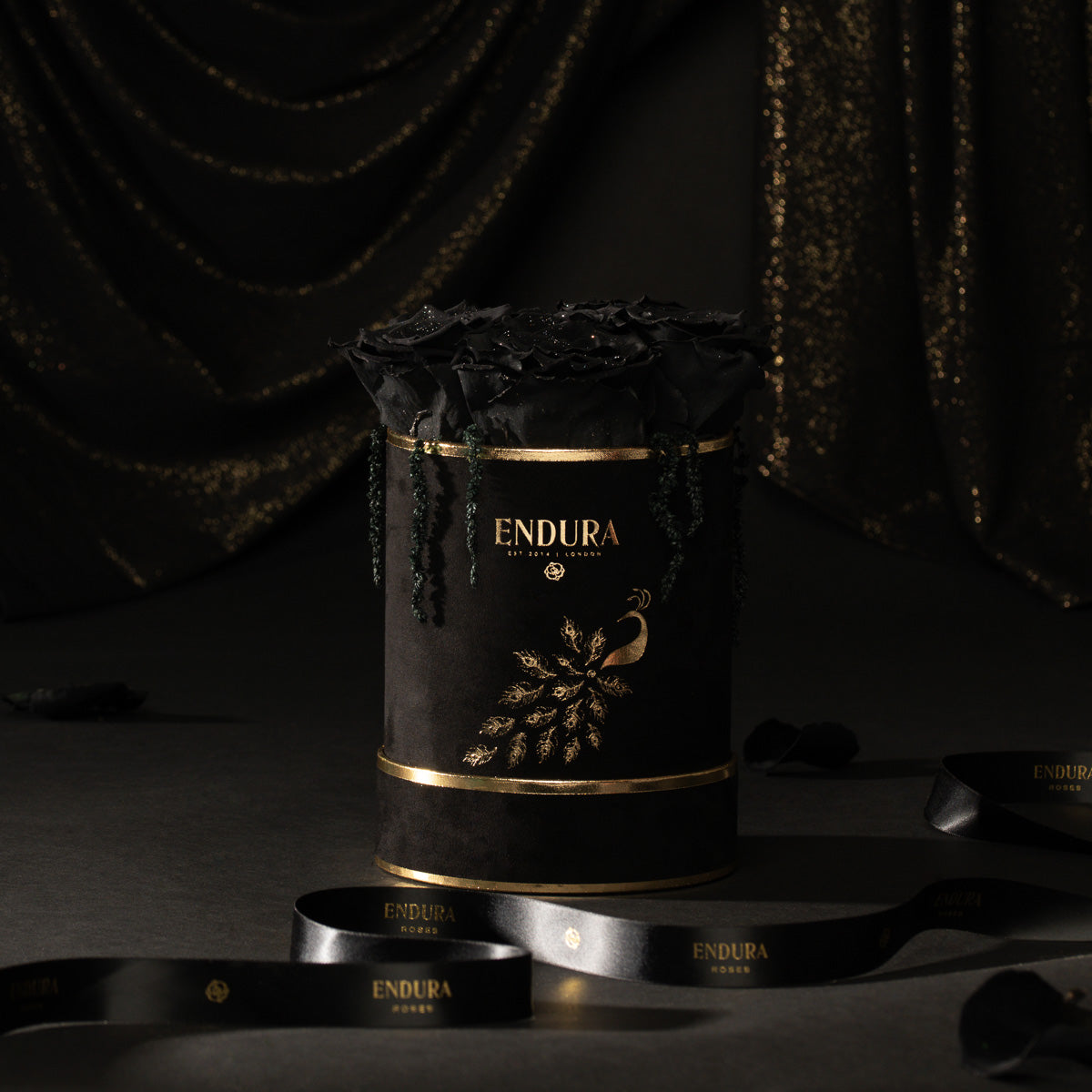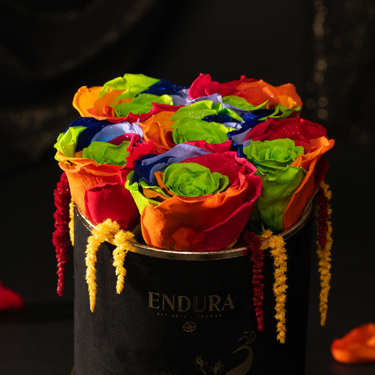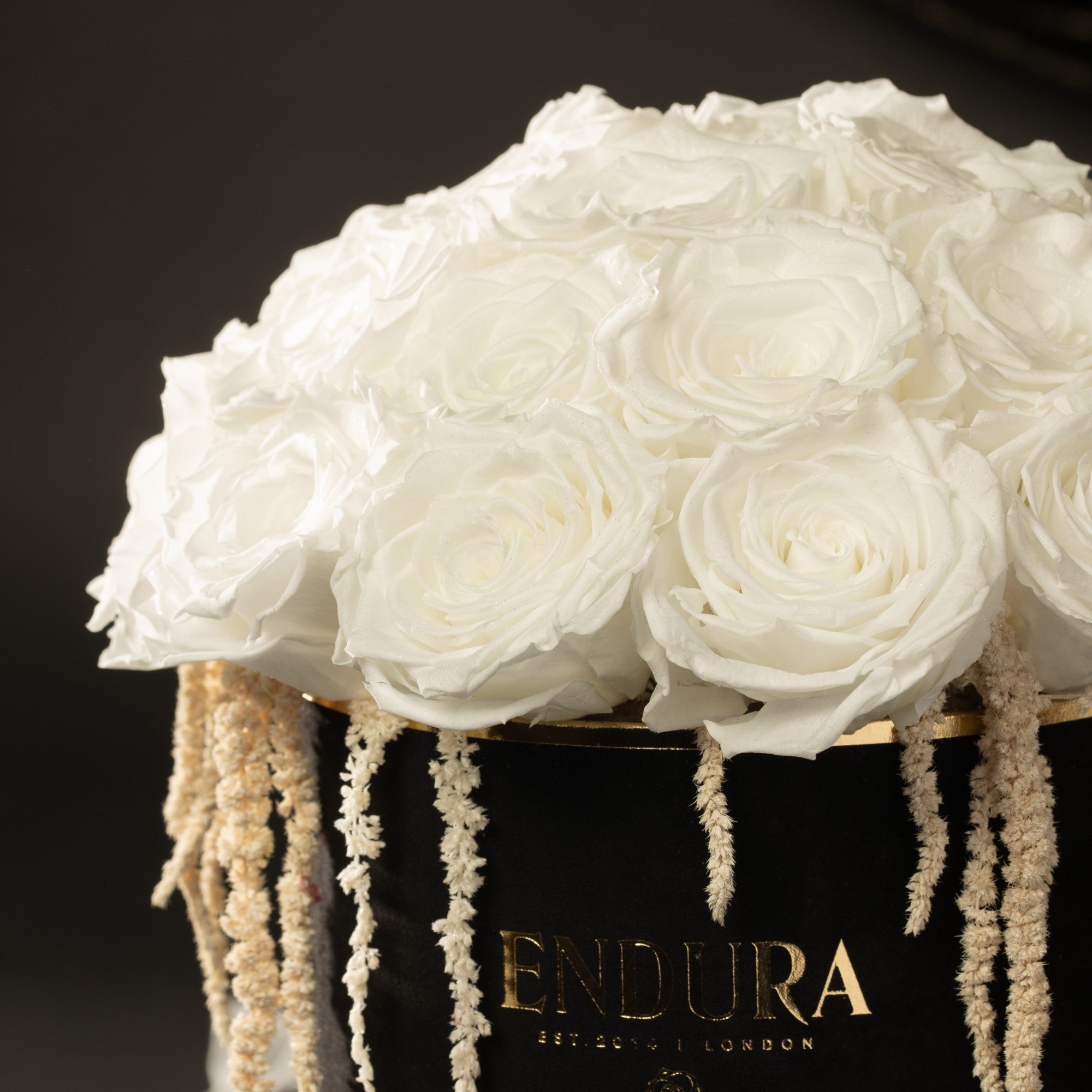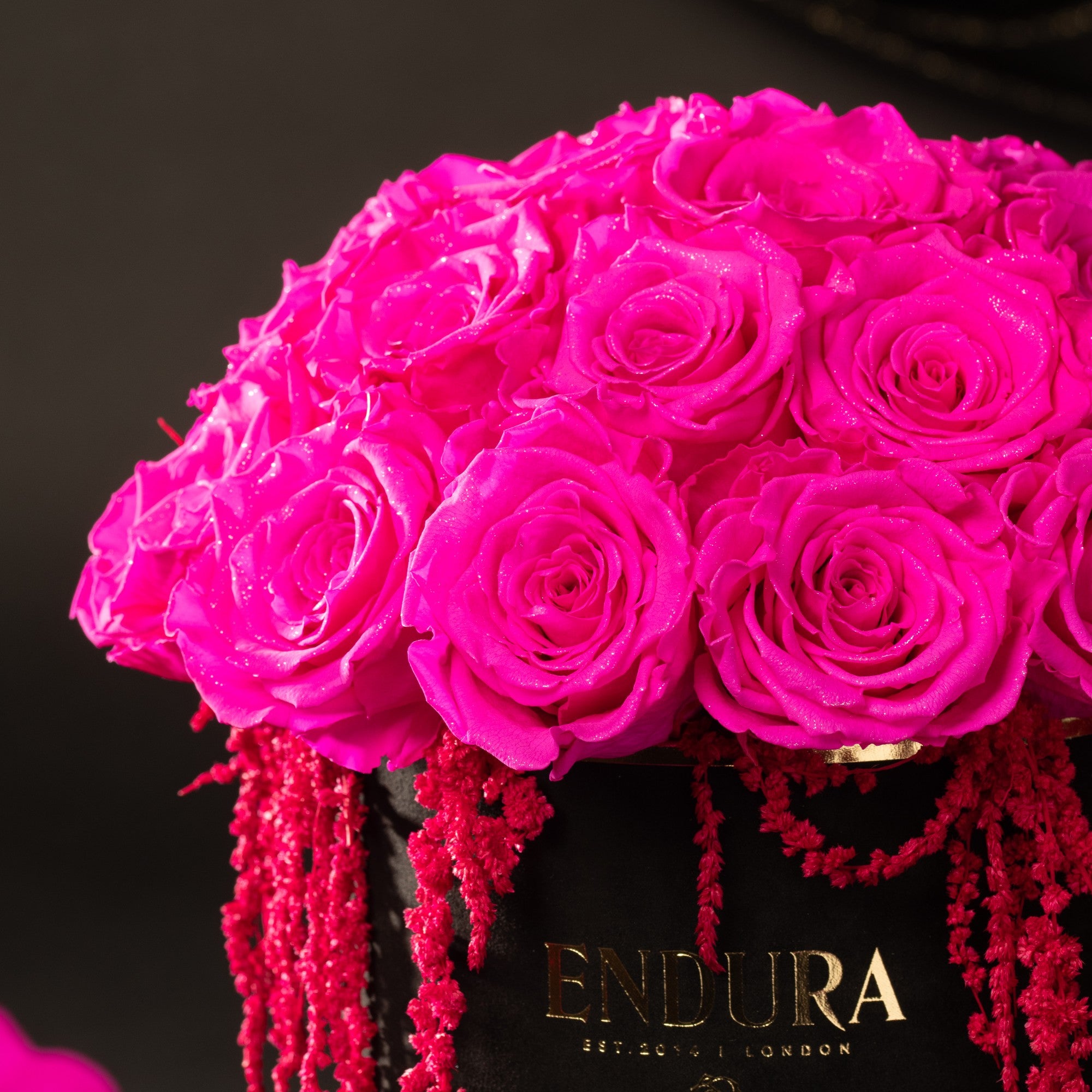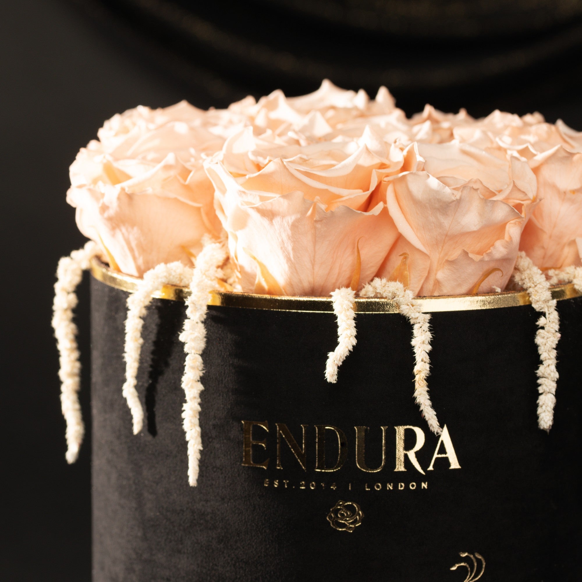 Endura Bloom is elegantly presented in a sumptuous velvet-textured box, within lies a curated selection of exquisite natural roses, each meticulously preserved to perfection and offered in an array of captivating shades. A symbol of timeless beauty and refinement; every bloom embodies artistry and precision, retaining its natural beauty for up to three years.