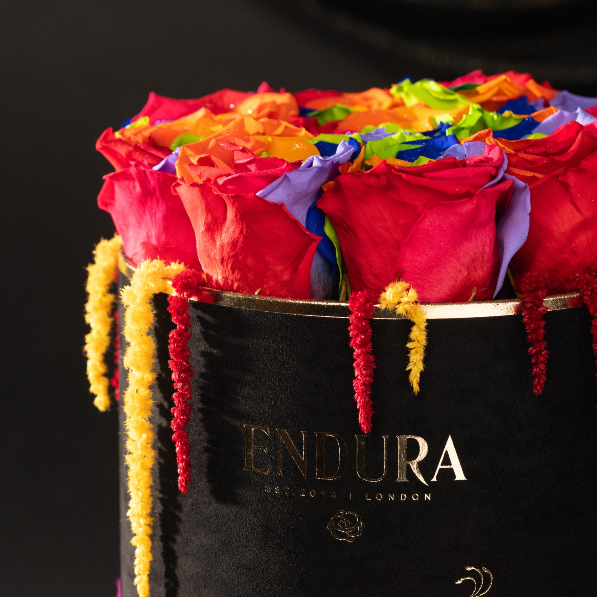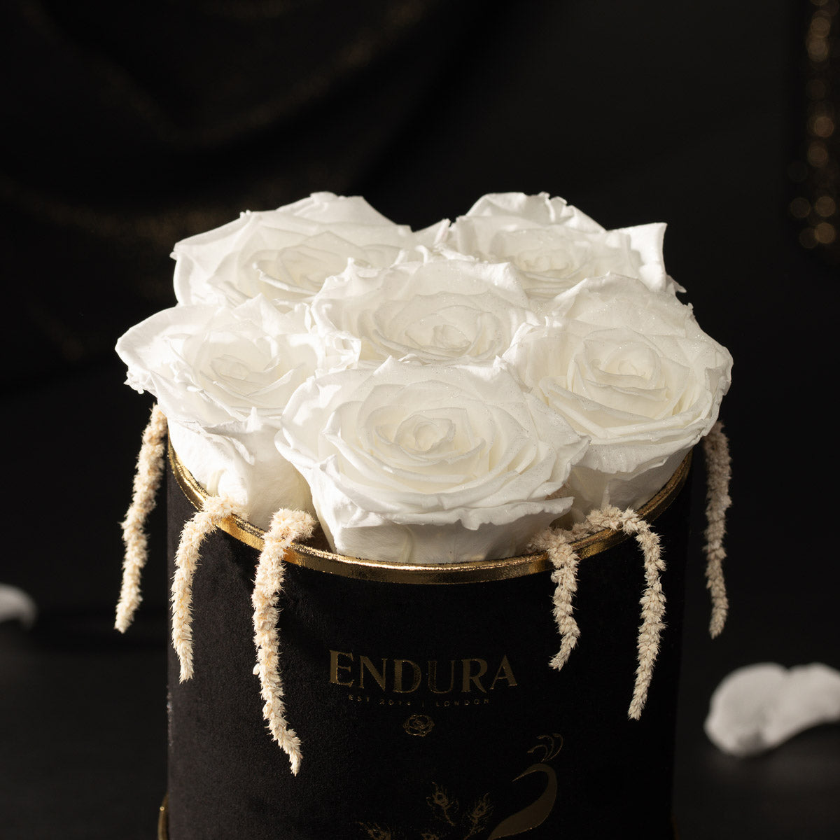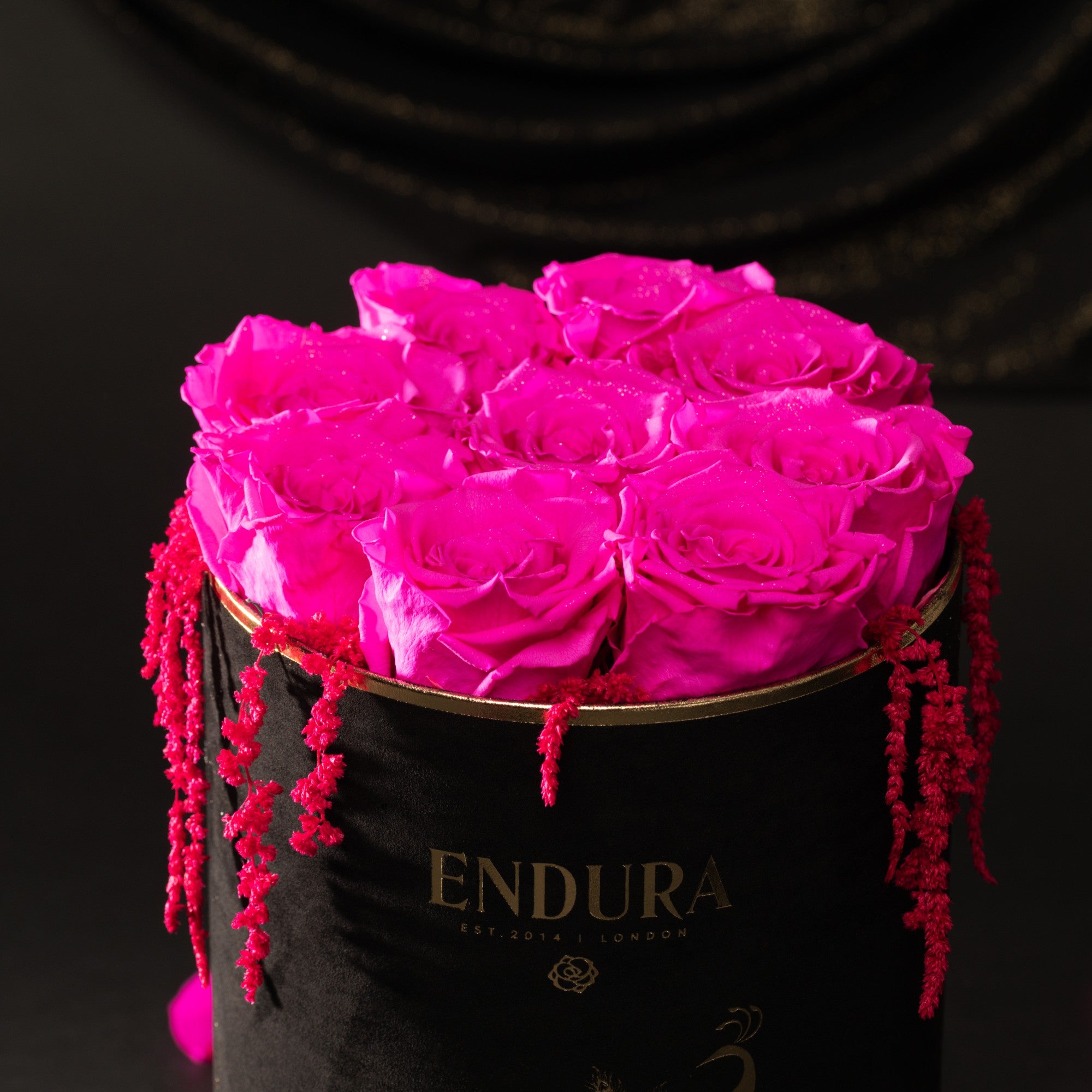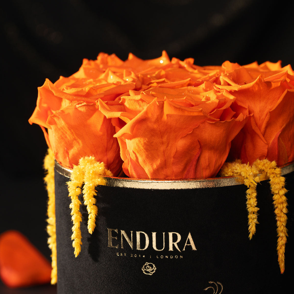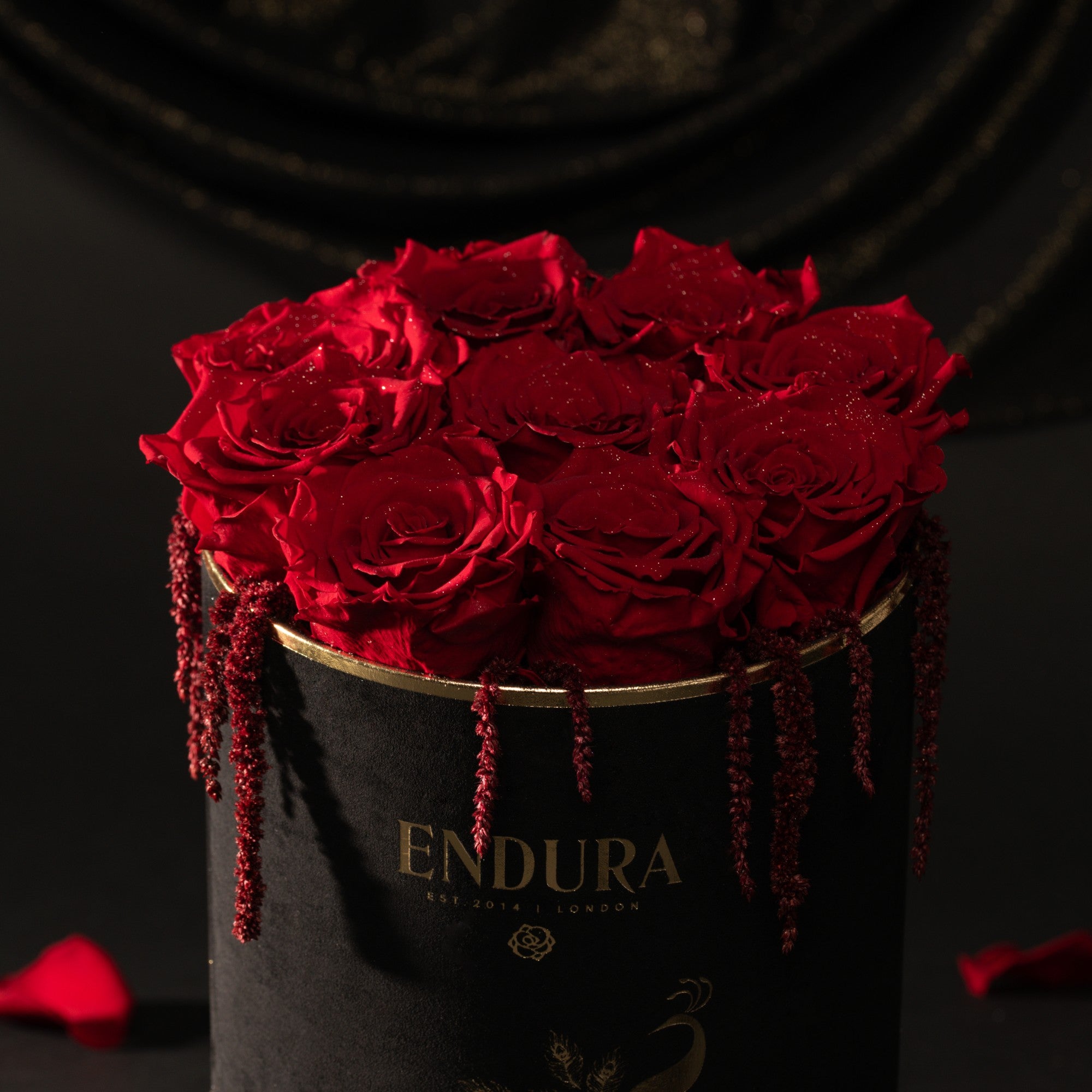 Endura Bloom is elegantly presented in a sumptuous velvet-textured box, within lies a curated selection of exquisite natural roses, each meticulously preserved to perfection and offered in an array of captivating shades. A symbol of timeless beauty and refinement; every bloom embodies artistry and precision, retaining its natural beauty for up to three years.
