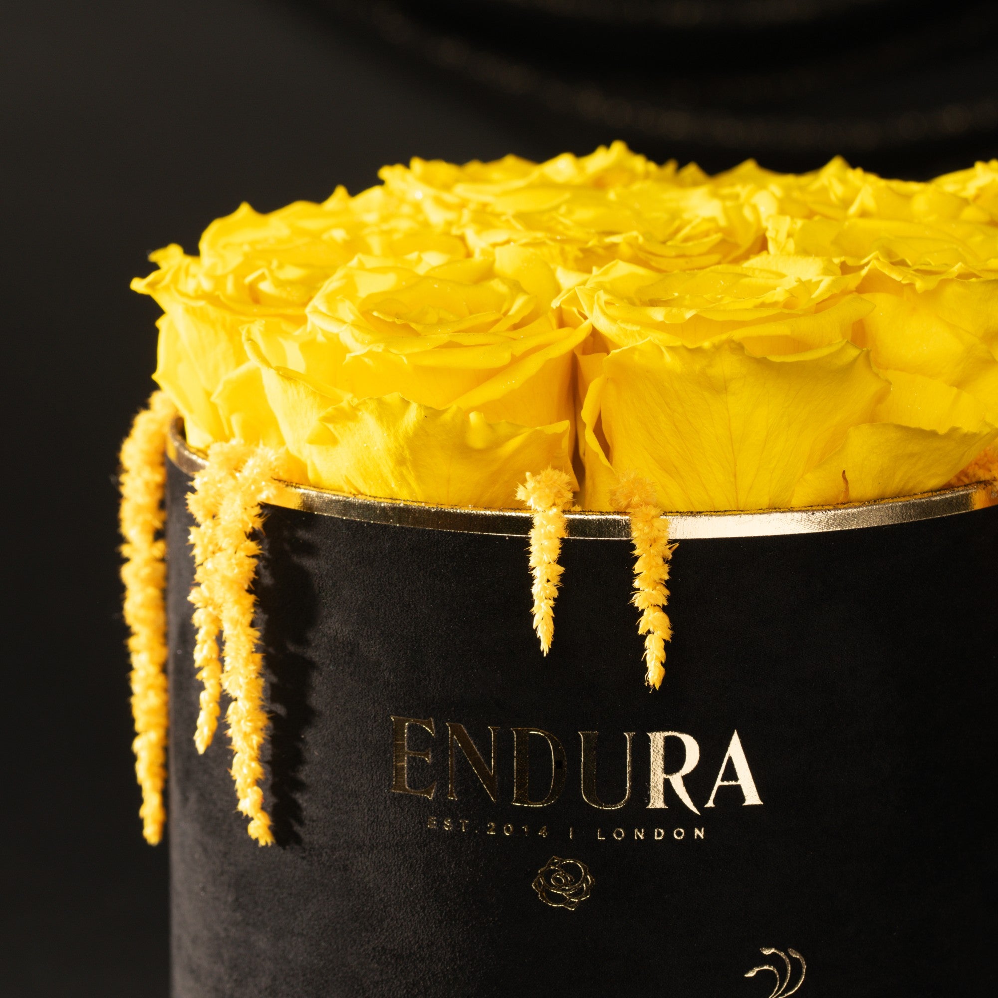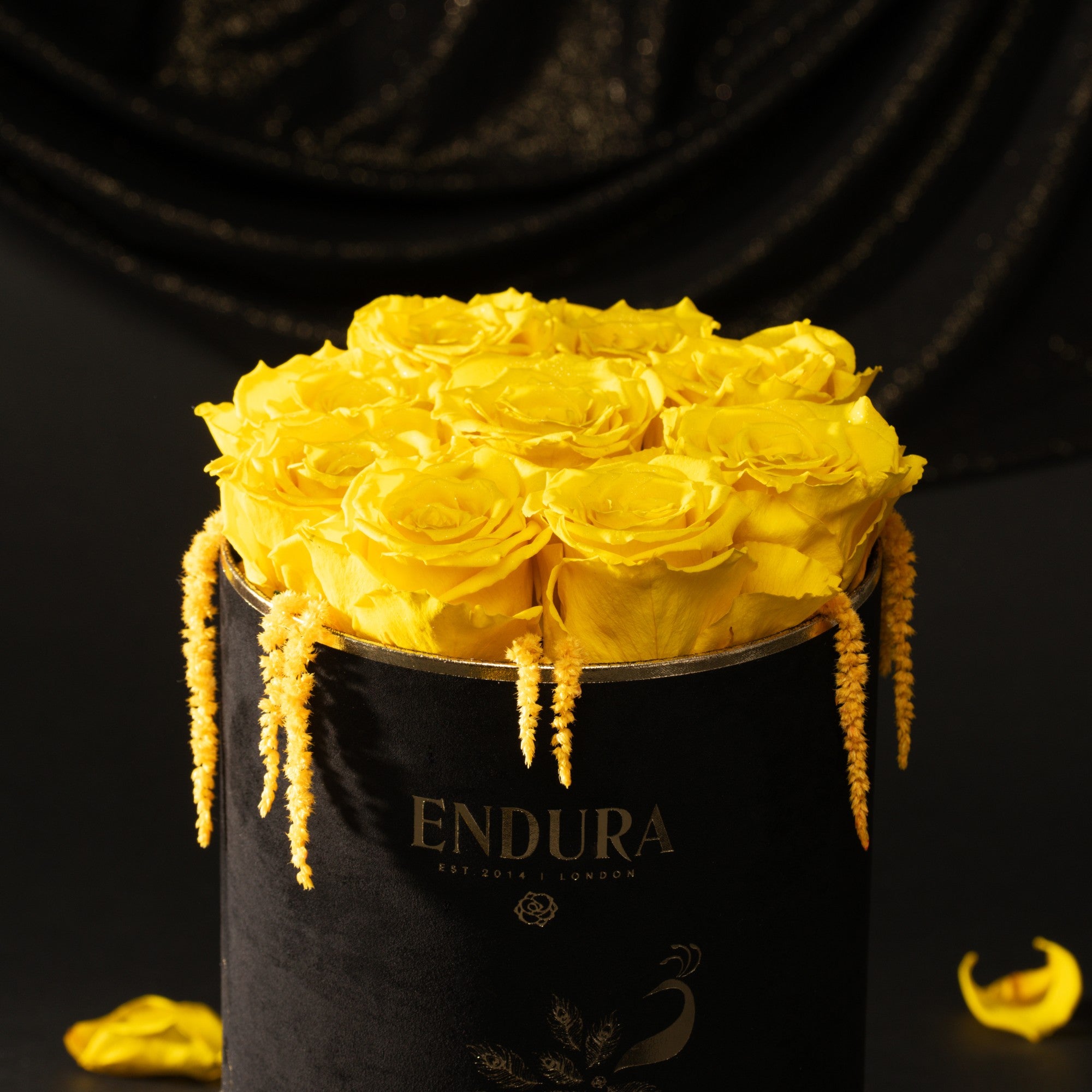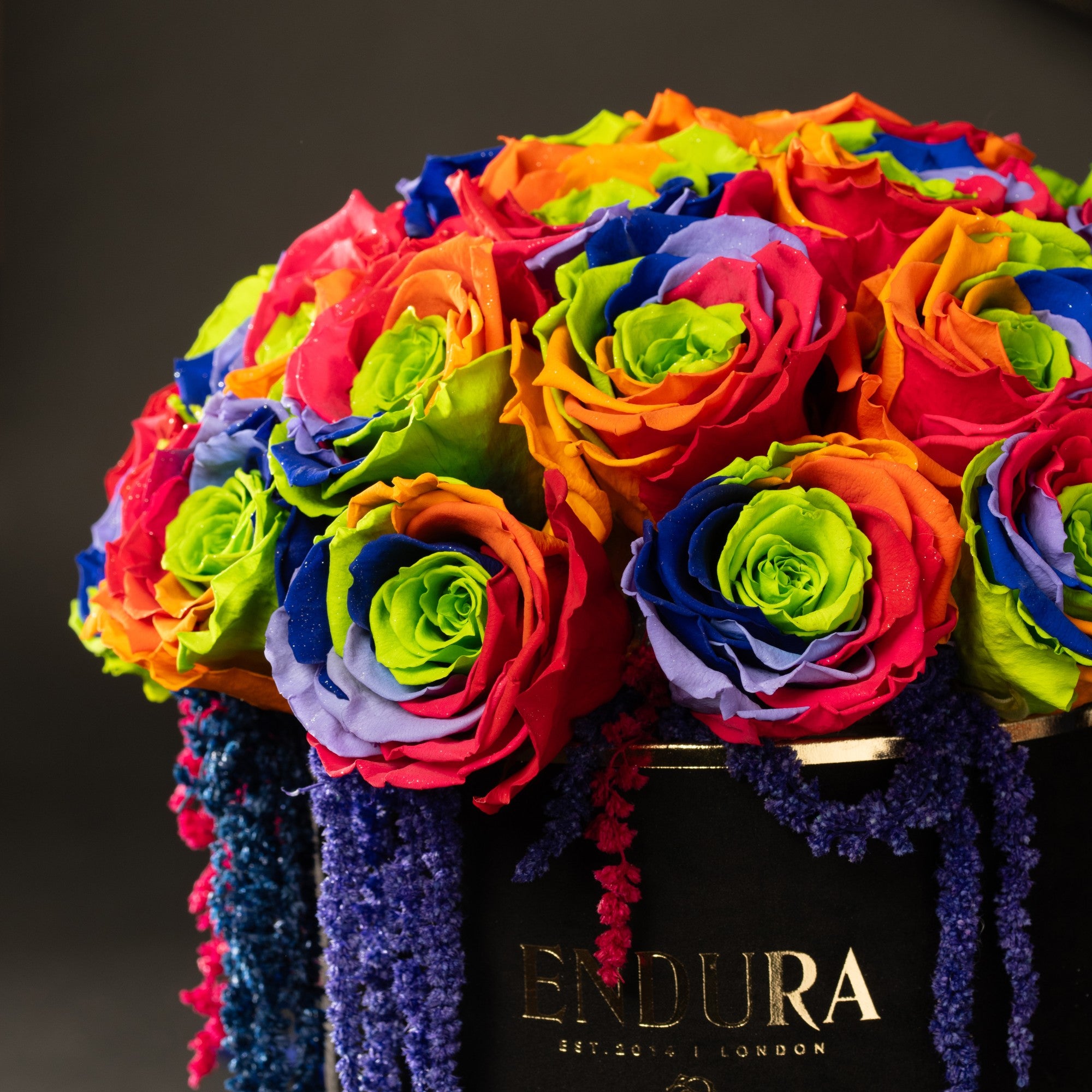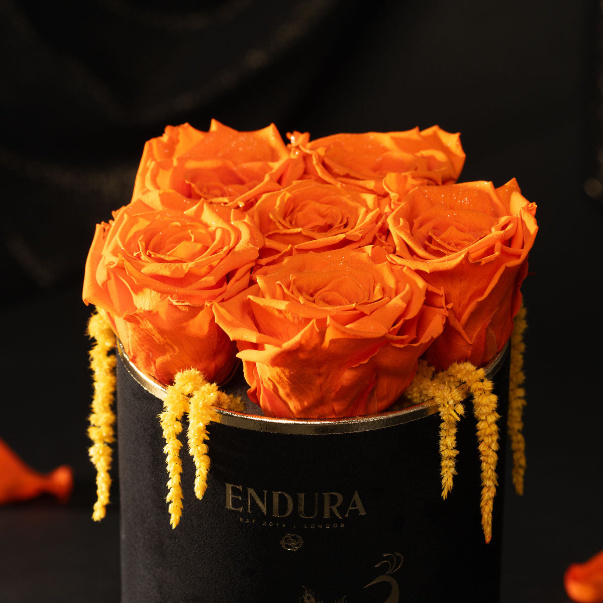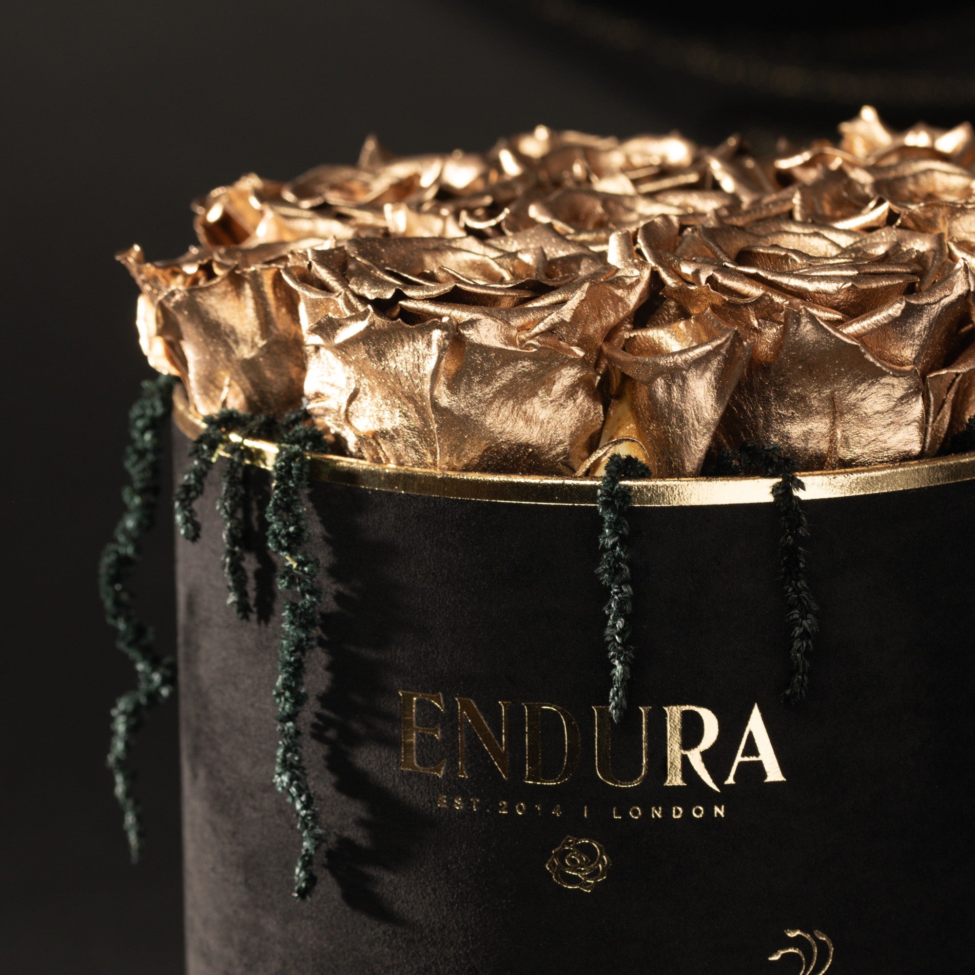 Endura Bloom is elegantly presented in a sumptuous velvet-textured box, within lies a curated selection of exquisite natural roses, each meticulously preserved to perfection and offered in an array of captivating shades. A symbol of timeless beauty and refinement; every bloom embodies artistry and precision, retaining its natural beauty for up to three years.