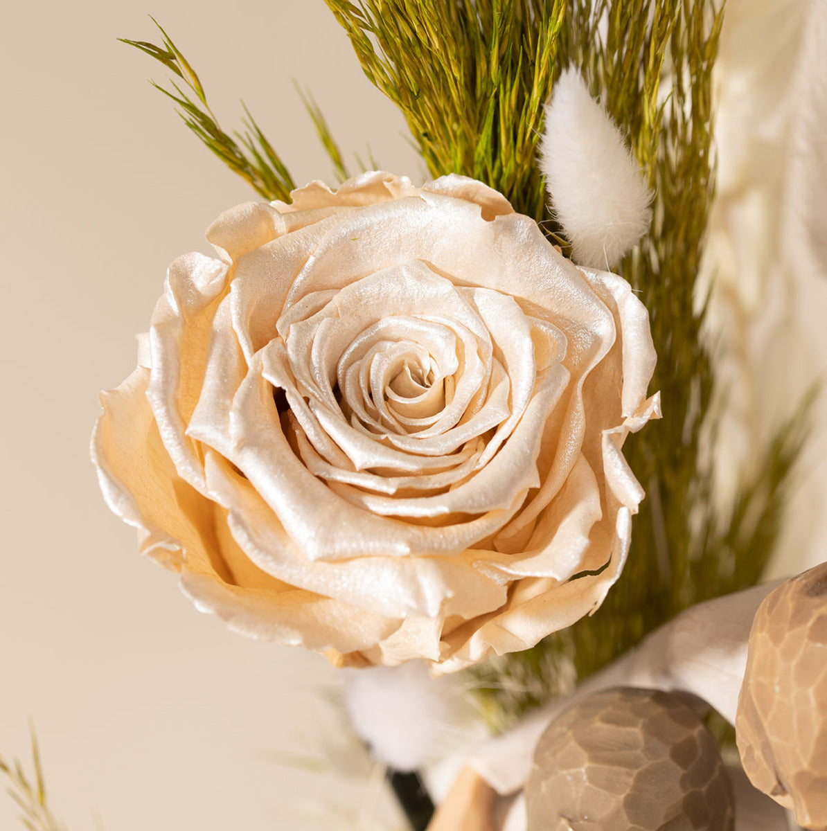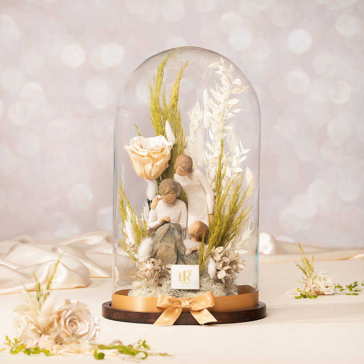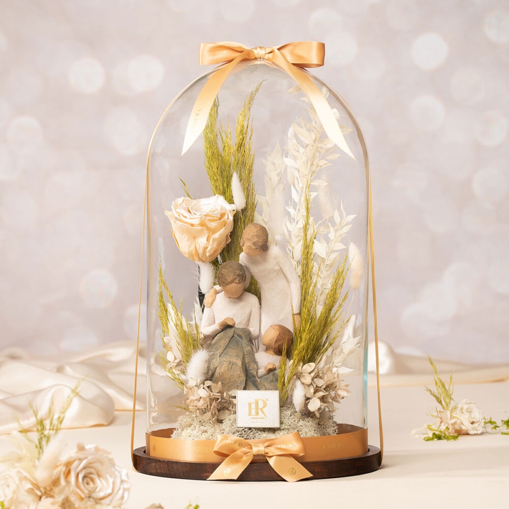 Encased within an air-tight jar to ensure everlasting perfection, a minimalist sculpture depicts three generations spending quality time together. Surrounding the piece of art are Endura Roses’ signature naturally enhanced floras, including our eternal rose in champagne, and preserved ruscus, lagurus, plumosa and metallic hydrangeas. The light toned aesthetic with hints of organic green and pale peach can manifest grace, peace and purity wherever the arrangement is placed.