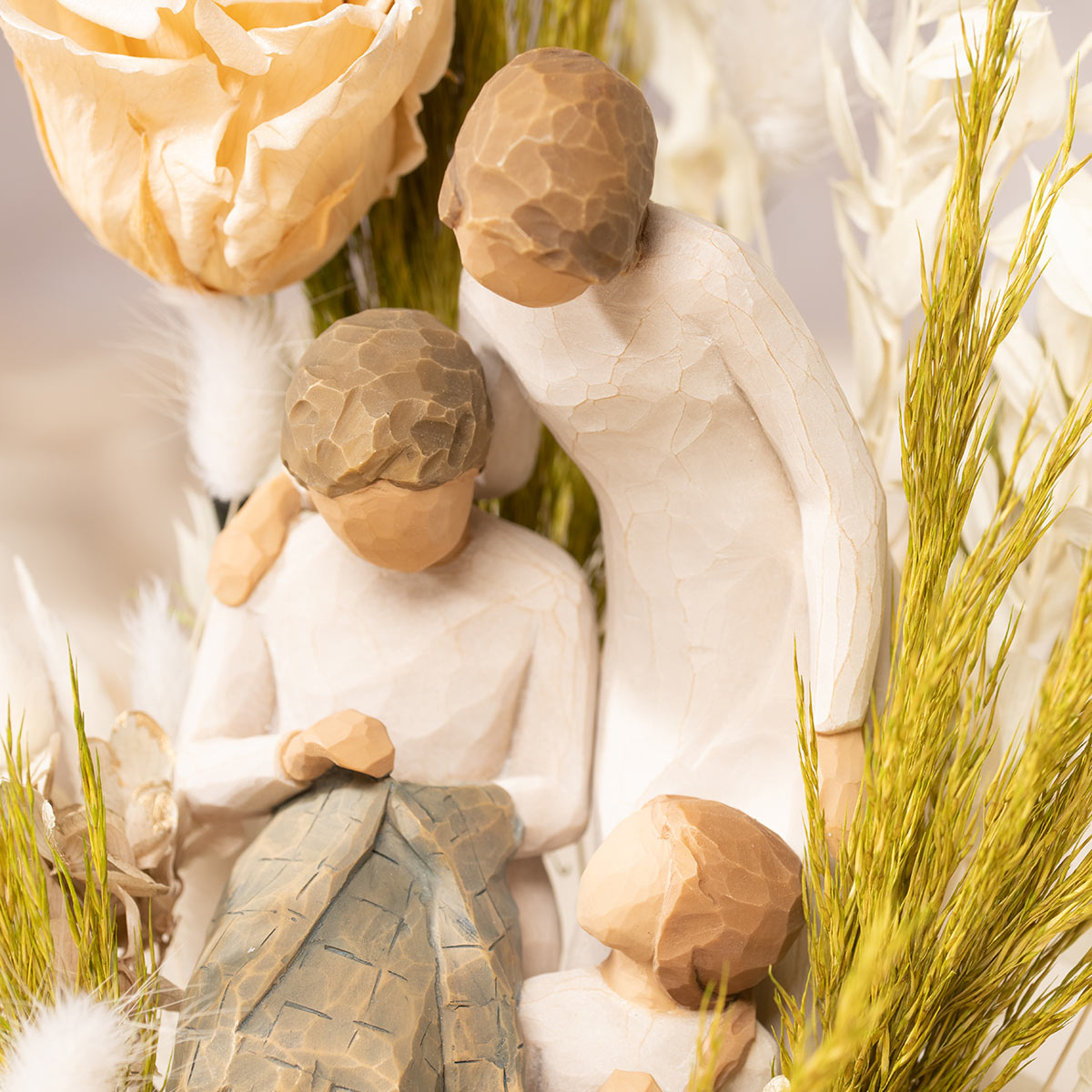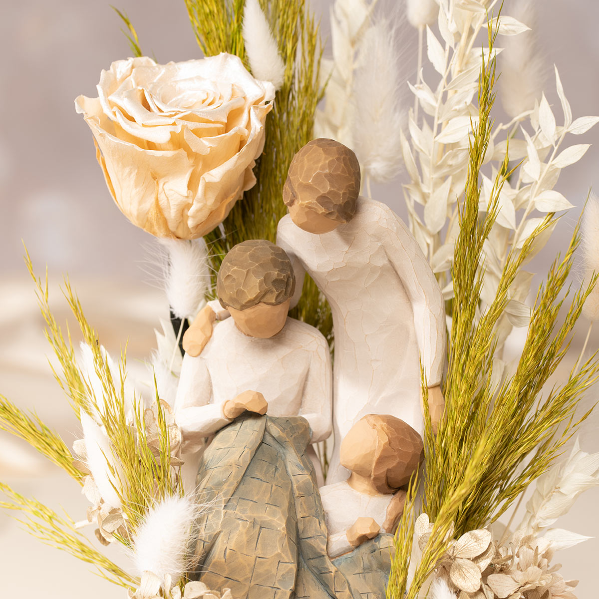 Three generations are depicted in contemporary impressionist sculpture, accompanying a champagne dried rose and delicate preserved foliage.